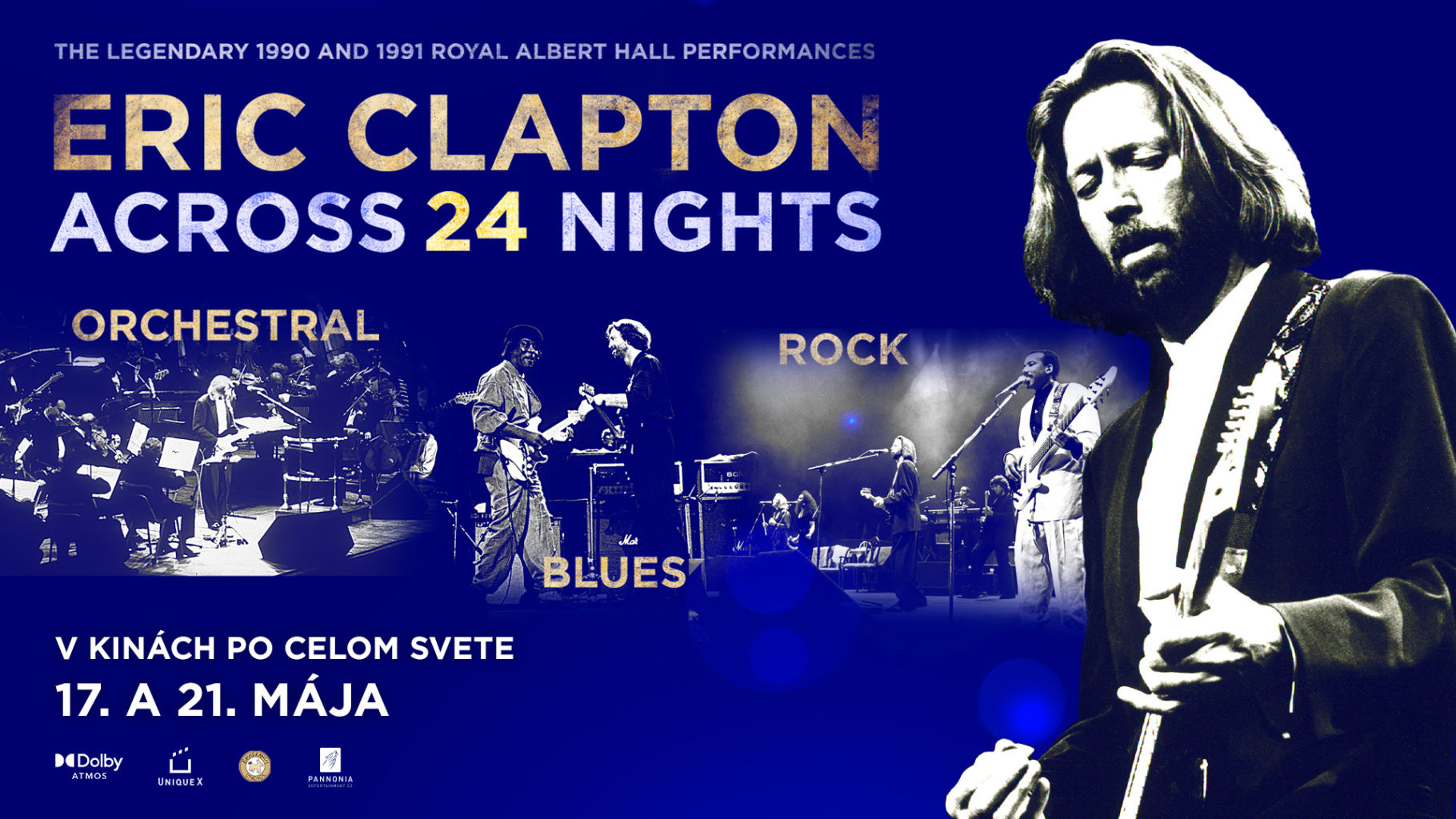 Eric Clapton je jedným z najúspešnejších anglických rockových gitaristov, spevákov a skladateľov. Je držiteľom ceny Grammy Award a trikrát bol uvedený do Rokenrolovej siene slávy ako osobnosť aj ako člen kapiel The Yardbirds a Cream. „V roku 1990 odohral Eric Clapton v londýnskej Royal Albert Hall 18 koncertov v rôznych zostavách i s filharmonickým orchestrom. Zaznel rock, blues i orchestrálne úpravy známych skladieb. Prekonal tak svoj vlastný rekord – 12 koncertov v Royal Albert Hall v roku 1989. O rok neskôr sa tam vrátil a odohral ďalších 24 koncertov. Tieto hudobné vystúpenia sa zapísali do histórie. A boli zaznamenané nielen zvukovo ako jeho v poradí piaty živý album, ale aj na film,“ hovorí Miro Ulman, dramaturg cyklu Music & Film, ktorý film Eric Clapton: Across 24 Nights lektorsky uvedie. Podľa neho po viac ako tridsiatich rokoch prichádza do kín „nový, definitívny a kompletne remastrovaný zostrih toho najlepšieho, čo počas oboch rokov v Royal Albert Hall odznelo. A súčasťou filmu sú aj doteraz nezverejnené vystúpenia.“