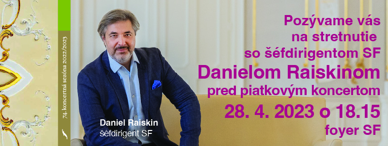 Pred piatkovým koncertom Slovenská filharmónia pozýva návštevníkov na stretnutie so šéfdirigentom Danielom Raiskinom, vo foyeri SF o 18.15, ktoré bude viesť a moderovať dramaturg SF Juraj Bubnáš.