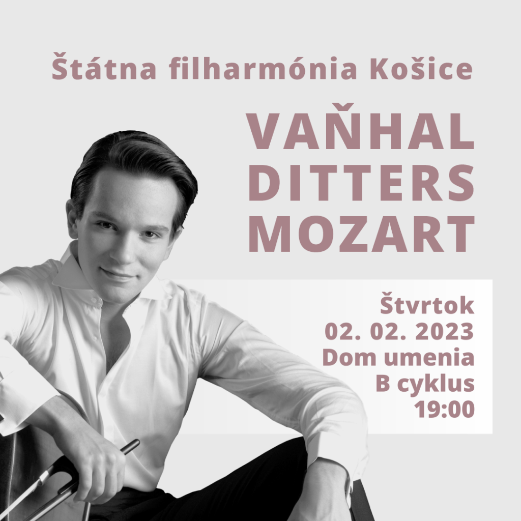 Abonentný koncert B cyklu VAŇHAL – DITTERS – MOZART so sólistom Indim Stivínom sa uskutoční vo štvrtok 2. februára 2023 o 19:00 v košickom Dome umenia. Verejná generálka sa začína o 10:00 a predkoncertné stretnutie s lektorom dramaturgie Petrom Katinom a hosťami o 18:00 v Malej sále.