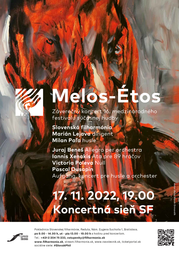 Na úvod večera zaznie dielo Allegro per orchestra Juraja Beneša, ktorý bol výraznou osobnosťou slovenskej avantgardy 60. rokov 20. storočia. Nasledovať bude kompozícia Ata pre 89 hráčov gréckeho skladateľa a architekta Ianisa Xenakisa a koncert pre husle a orchester Aufgang jeho žiada Pascala Dusapina. Zaznie v interpretácii Milana Paľu, jedného z najvýraznejších interpretačných zjavov domácej generácie, ktorý v roku 2021 nahral CD s komornými dielami skladateľa. Program doplní dielo Null kyjevskej rodáčky Viktorie Polevy, súčasnej ukrajinskej skladateľky. Program súčasnej tvorby zaznie v naštudovaní slovenského dirigenta a skladateľa Mariána Lejavu, špecialistu na tento repertoár.