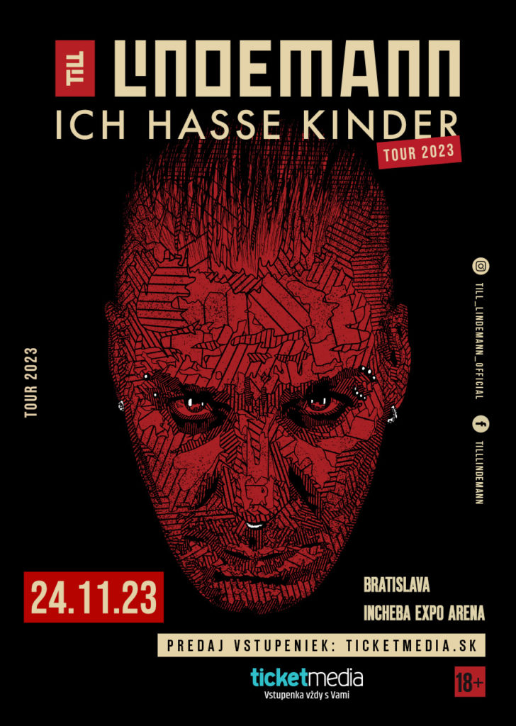 V hlavnom meste Slovenska predvedie neprehliadnuteľný Till Lindemann svoje vlastné Ich Hasse Kinder Tour 2023. Rocker, hudobník a básnik si so sebou neberie svojho kolegu z projektu Lindemann, predstaví však skladby z oboch albumov Skills In Pills aj F & M. Fanúšikovia sa môžu tešiť na množstvo experimentálnych a nekonvenčných hudobných nápadov, pôsobivé videoprojekcie a pyrotechnické efekty. Nenechajte si ujsť najväčšiu hudobnú udalosť roka. Stretneme sa v nových termínoch 24. novembra 2023 v Incheba Expo Aréne v Bratislave a 22. novembra 2023 v Tipsport Aréne, po novom v Športovej hale v Holešovicích v Prahe.