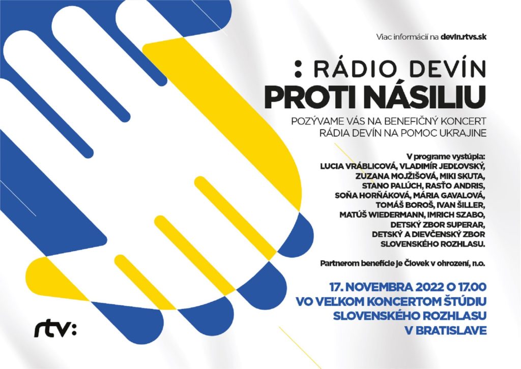 Rádio Devín oslavuje 50. výročie začiatku svojho vysielania. K tomuto významnému výročiu pripravilo množstvo programov, relácií, rozhovorov, dokumentov, ktorými si svoje prvé vysielanie pripomína. Od 24. februára 2022 však má v umeleckom rádiu priestor aj podpora ľudí na Ukrajine. Vojna, ktorú vo svojom päťdesiatročnom trvaní približovalo rádio cez umelecké diela a spomienky minulosti, sa stala realitou v susednej krajine. Bezprostredné zaradenie ukrajinskej literatúry, hudby či podpora umeleckých i spoločenských aktivít nechýba v Rádiu Devín počas celého roka. V deň, keď si na Slovensku a v Českej republike pripomíname Deň boja za slobodu a demokraciu, chce aj Rádio Devín vyslať jasné posolstvo. Benefičný koncert Rádio Devín proti násiliu je toho dôkazom.