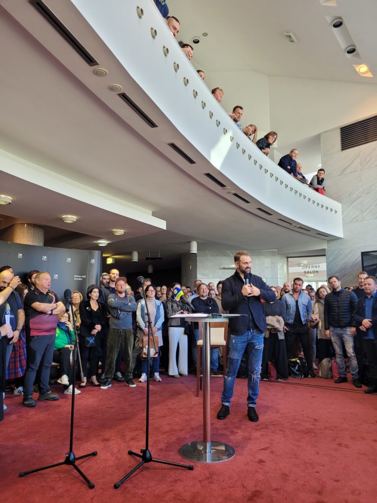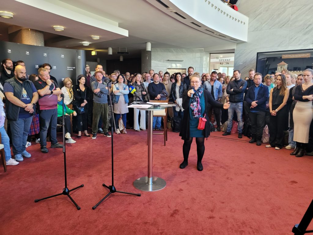 „Radi by sme osvetlili okolnosti, ktoré sa stali v uplynulých dňoch aj zo strany vedenia Slovenského národného divadla,“ privítala tlačová tajomníčka Izabela Pažítková bohaté zastúpenie novinárskej obce v Dvorane novej budovy SND. Odchádzajúcemu generálnemu riaditeľovi Matejovi Drličkovi prišlo vyjadriť podporu desiatky ľudí – nielen vedenie súborov, ale najmä herci, členovia baletného súboru, operní sólisti medzi nimi chýbali. Za Operu boli prítomní dirigent, niektorí členovia zboru, orchestra a šéf opery, Lubor Cukr.