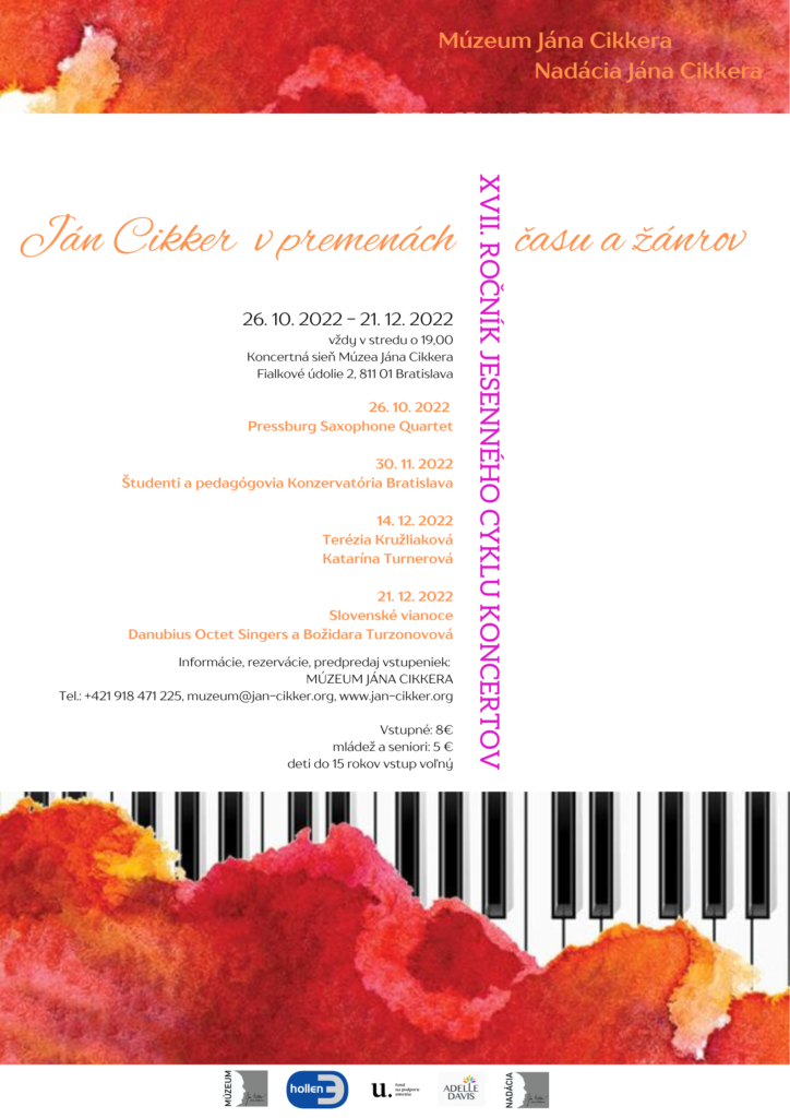 Večer (14. 12.) bude unikátny aj tým, ze poslucháči si budú môcť vychutnať aj ďalšie podobné diela tohto nezvyčajného dua. Rok 2022 je 111. výročím narodenia Jana Cikkera a 33. výročím jeho skonu. Bude to práve 21. decembra, kedy zaznie aj záverečný koncert nášho cyklu - tento raz literárno - hudobný. O umelecké slovo sa postará Božidara Turzonovová a vokálnu zložku bude reprezentovať Danubius Octet Singers pod vedením dirigenta Daniela Simandla. Koncert bude ouvertúrou k vianočným sviatkom, keďže jeho dramaturgia nesie názov Slovenské Vianoce. Je už 17-ročnou tradíciou, ze po každom z koncertov sa publikum pri čaši vína môže stretnúť a porozprávať s účinkujúcimi umelcami. Po záverečnom vianočnom koncerte pri Cikkerovskom krbe sa bude podávať čaša vína vareného. V úlohe hostiteľa bude už tradične koncerty šarmantne moderovať Prof. Peter Michalica, predseda správnej rady Nadácie Jána Cikkera.