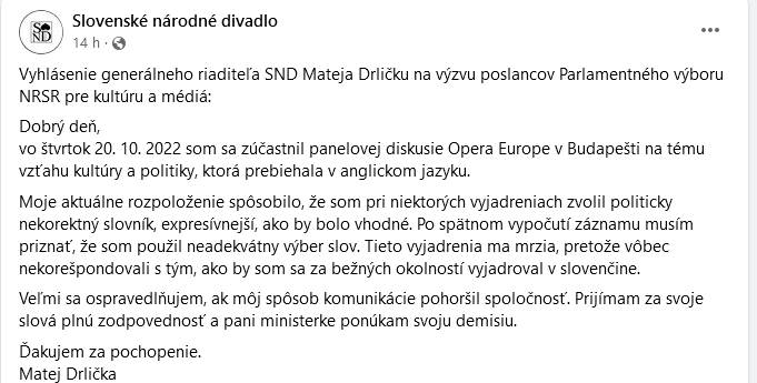 Ide o reakciu, ktorá súvisí s vyjadreniami šéfa SND Mateja Drličku na panelovej diskusii v Budapešti, ktorej sa zúčastnil vo štvrtok 20.10.2022. Priznal, že použil v prejave neadekvátny výber slov. Vyjadrenie uvádzame v plnom znení, bez redakčných úprav: