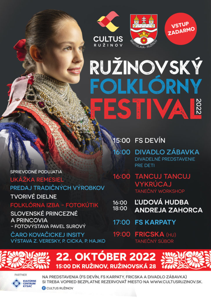 Na predstavenia (FS Devín, FS Karpaty, Fricska a Divadlo Zábavka) si treba vopred bezplatne rezervovať miesto na www.cultusruzinov.sk.