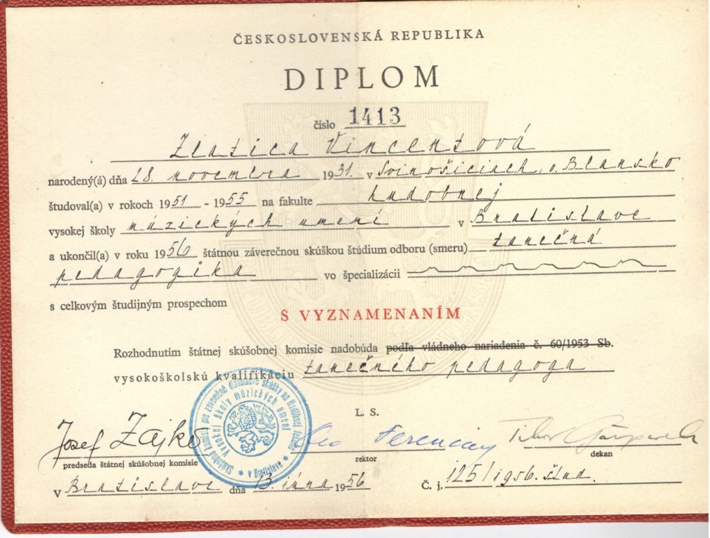 Podarilo sa mi úspešne zmaturovať v roku 1951. Vtedy sa mi z materiálov, ktoré nám ponúkala škola, podarilo získať informáciu o vysokých školách, kde som sa dozvedela, že v Bratislave sa otvára štúdium pedagogiky tanca a choreografie. Tak ten chrobák z mojej hlavy mi „nevyfučal - robila som si - čo som chcela“. Podala som si prihlášku a bola som prijatá.