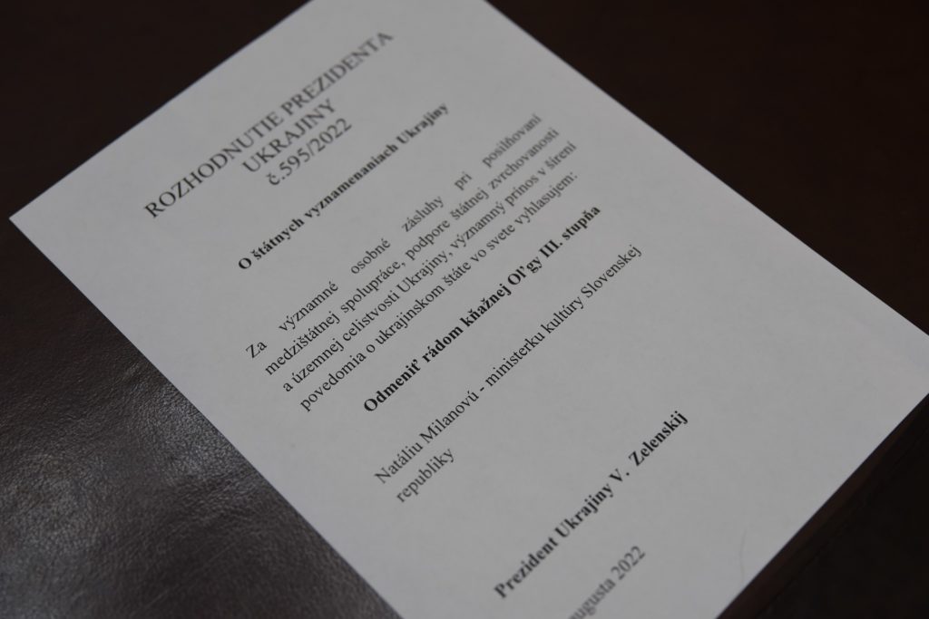 Štátne ocenenie udelil Zelenskyj šéfke nášho rezortu kultúry ako jedinej slovenskej ústavnej činiteľke na znak vďaky za jej neustálu podporu a osobnú angažovanosť v pomoci Ukrajine od začiatku vojenského útoku zo strany Ruska. „Za významné osobné zásluhy pri posilňovaní medzištátnej spolupráce, podpore štátnej zvrchovanosti a územnej celistvosti Ukrajiny, významný prínos šírenia povedomia o ukrajinskom štáte vo svete,“ menuje dôvody ocenenia Rádu kňažnej Oľgy prezident.