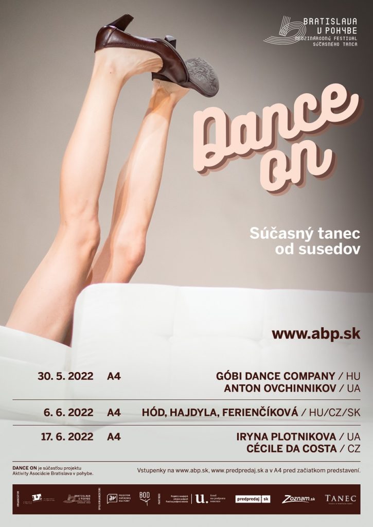 DANCE ON sa uskutoční 30. mája, 6. a 17. júna 2022 v A4 – Priestore súčasnej kultúry. „Rozhodnutie venovať celý výťažok zo vstupného na predstavenia Dance On na pomoc Ukrajine padlo už dávnejšie, v podstate celkom skoro po začiatku vojny u našich susedov. Vtedy sme ešte netušili, že konflikt bude trvať tak dlho, o to viac považujeme túto formu pomoci za dôležitú aj dnes, keď možnosti pomôcť už mnohí z nás vyčerpali a pritom naša pomoc je stále potrebná. Prostriedky sme sa rozhodli poskytnúť Človeku v ohrození, dôveryhodnej organizácii, ktorá pomáha ako priamo na Ukrajine, tak aj tým, ktorí pred konfliktom utiekli na Slovensko,“ povedala výkonná riaditeľka festivalu Bratislava v pohybe Katarína Figula s tým, že sa snažili poskytnúť pomoc aj adresnejšie, konkrétnym ľuďom. „Spojili sme sa preto s Antonom Ovchinnikom, ktorý reprezentuje Ukrajinu v sieti Aerowaves. Anton nám sprostredkoval kontakt na dve choreografky a tanečné pedagogičky, ktoré aj s deťmi našli útočisko v Bratislave. Choreografickú tvorbu jednej z nich, Iryny Plotnikovej, predstavíme v posledný večer Dance On. Uvedieme aj tanečný film, ktorý Anton natočil v polovici apríla v dedine Morozivka neďaleko Kyjeva,“ dodala Katarína Figula.
