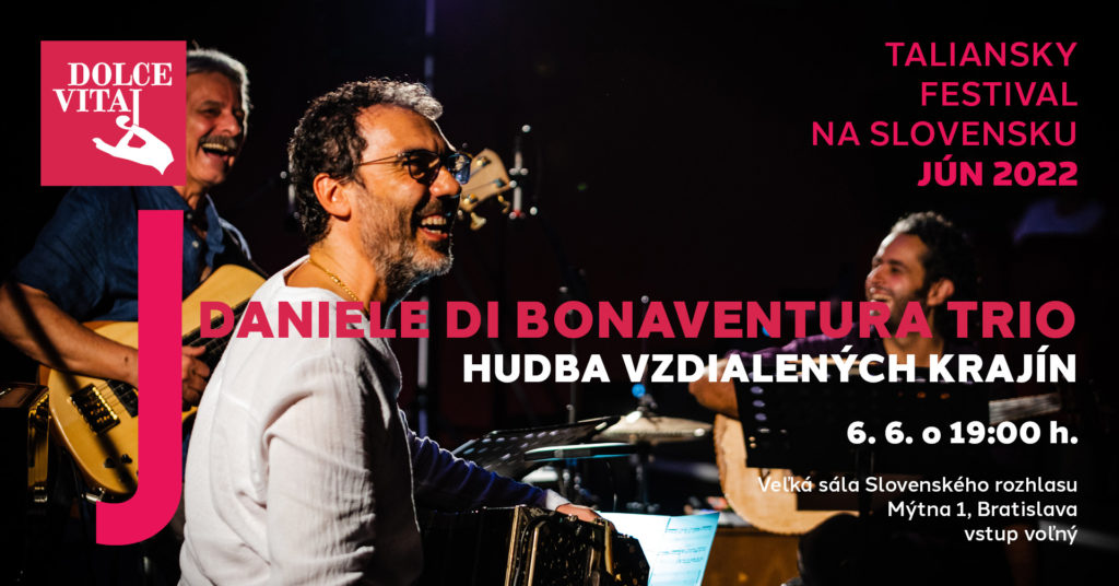 Úvodný koncert festivalu Dolce Vitaj bude patriť výnimočnému zoskupeniu hudobníkov, ktorí vždy spolupracovali s umelcami svetového mena. DANIELE DI BONAVENTURA TRIO sa v Bratislave predstaví po prvý raz, v pondelok 6. júna 2022 o 19.00 hod. vo Veľkom koncertnom štúdiu Slovenského rozhlasu. Repertoár koncertu vychádza z hudobných tradícií krajín Latinskej Ameriky, Stredného východu, Severnej Afriky a južnej Európy.