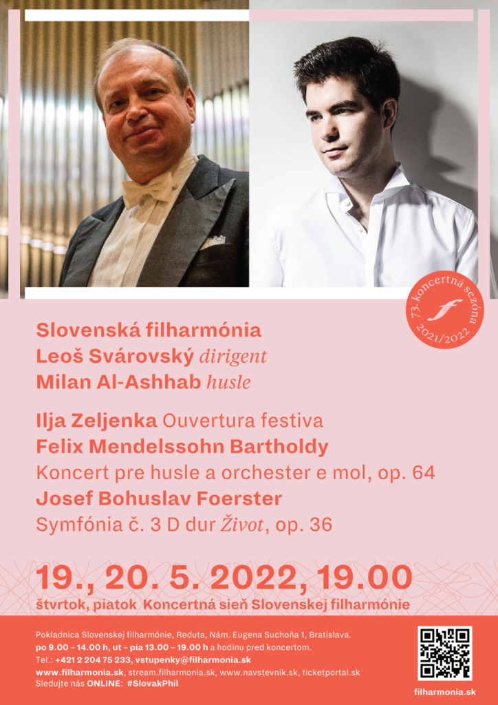 Na úvod večerov zaznie Ouvertura festiva, dielo ktoré Ilja Zeljenka premiéroval na Bratislavských hudobných slávnostiach v roku 1998. V interpretácii mladého českého virtuóza Milana Al-Ashhaba si vypočujeme slávny Koncert pre husle a orchester e mol, op. 64 Felixa Mendelssohna Bartholdyho, ktorý patrí medzi najobľúbenejšie koncerty 19. storočia pre tento nástroj. Skladateľ ho komponoval dlhých šesť rokov. Vznik diela komunikoval s priateľom a huslistom Ferdinandom Davidom, koncertným majstrom lipského orchestra Gewandhaus, ktorý dielo premiérovo uviedol v roku 1845.