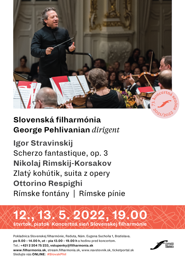 Korsakov bol pedagógom Igora Stravinského a krátku dobu u neho študoval aj taliansky skladateľ Ottorino Respighi. Symfonický večer uzavrie práve dvojica jeho veľkolepých symfonických básní Rímske fontány a Rímske pínie. Program koncertov zaznie v naštudovaní francúzsko-amerického dirigenta Georgea Pehlivaniana, ktorý hovorí: „Jedným z mojich životných cieľov je zasiahnuť život poslucháča pomocou hudby.“