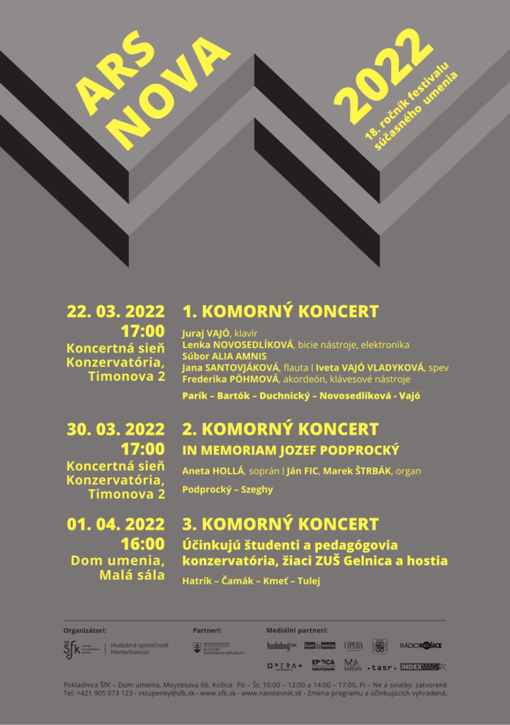 Už v utorok 22. marca sa o 17:00 uskutoční 1. Komorný koncert v Koncertnej sieni Konzervatória na Timonovej ulici č. 2 v Košiciach. Predstavia sa študenti a pedagógovia - Juraj Vajó, Lenka Novosedlíková, Jana Santovjáková, Iveta Vajó Vladyková, Frederika Pöhmová a súbor Alia Amnis.