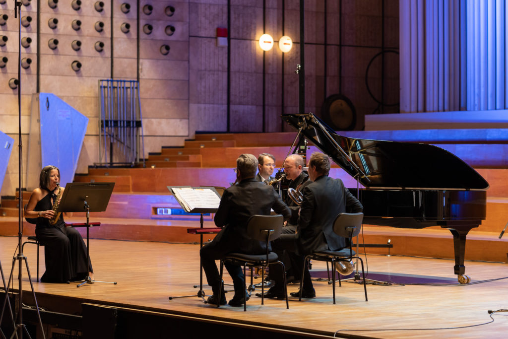 S Ladislavom Fančovičom sa kvarteto zohralo za pár dní. Najsignifikantnejšie to bolo počuť na Mozartovom Kvintete pre klavír a dychové nástroje Es dur KV 452, ktoré znelo na ich spoločnom prvom koncerte, rovnako o pár dní neskôr aj vo Veľkom koncertnom štúdiu v Rozhlase (10. marca 2022). Počuli sme vyzretú interpretáciu, s mozartovskou eleganciou a ľahkosťou, hráči boli absolútne zladení, zohratí a bolo zjavné, že si sadli muzikantsky. Zradný je najmä pomalý úvod prvej časti v tempe Largo, kde počujeme tému striedavo v klavíri a v jednotlivých saxofónoch. Tie zneli nádherne, dynamicky vyvážene, tému vyspievali krásne spevne, napriek nie expresívnej dynamike. Fančovičove rovnomerné trilky, zvučné, nosné, farebné tóny vytvárali spoločne s kvartetom hneď úvodom komplexný tvar. Následne, keď skladba nabrala rýchlejšie tempo, sme obdivovali behy v svižnom tempe, ktorým nechýbala grácia a ľahkosť, odťahy boli interpretované dôsledne, no prirodzene muzikantsky. Stretli sme sa s čistým Mozartom interpretovaným na princípoch klasicistickej hudby – čo je v prípade saxofónov až neskutočné. Kultivovanosťou tvorby tónu sa dokázali hráči priblížiť ku kráse a čistote tohto génia a interpretovať jeho hudbu verne, bez afektov.