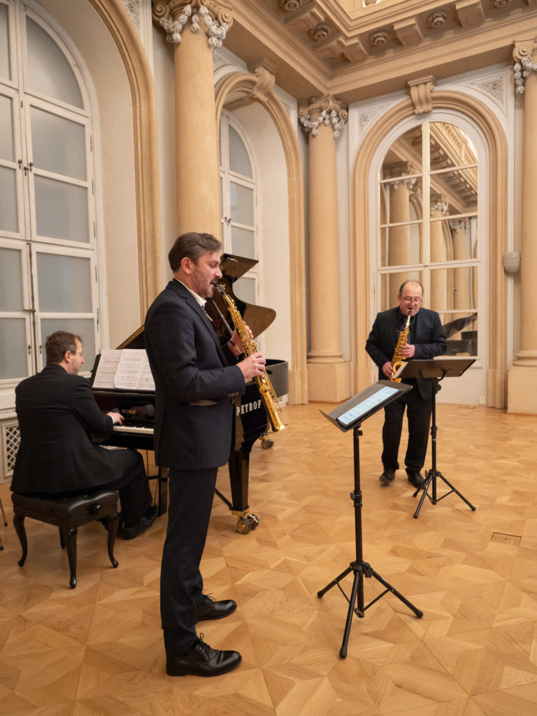 Ešte pred týmto koncertom sa však konal Galakoncert majstrov saxofónu v Zrkadlovej sieni Primaciálneho paláca, na ktorom sa predstavili šiesti špičkoví zahraniční lektori majstrovských kurzov tohtoročnej Saxophobie. Večer otvoril slovenskému publiku známy interpret, francúzsky alt saxofonista Philippe Portejoie. Pieseň minnesängrov Alexandra Glazunova má v sebe typickú vrúcnu lyriku a expresiu, romantizmus, ktorý tomuto autorovi mnohí vyčítali. So saxofónom v sprievode klavíra (Ladislav Fančovič) zrazu široké kantilény, nadobudli úplne iný rozmer. Portejoie je typ interpreta, ktorý vie vyspievať veľké melódie, dať im ten správny oblúk, aby vyzneli s vrúcnym výrazom a nostalgiou. Veľmi dobre pracoval s tempami a v tomto diele mu bol skvelým hudobným partnerom Ladislav Fančovič, ktorý dokázal so saxofónom dýchať. Saxofonista prekrásne vypracoval skladbu dynamicky – od plnšieho tónu vedel prejsť do vyvážených úsekov v pianissime – je až neuveriteľné, ako krásne znie aj v týchto dynamických odtieňoch práve alt saxofón. Ostatné z rodiny saxofónov prepáčia, no práve altka má tieto unikátne zvukové danosti (ak má aj hráča skutočne dobrých kvalít) – znie zamatovo a pritom nosne aj v piánach.