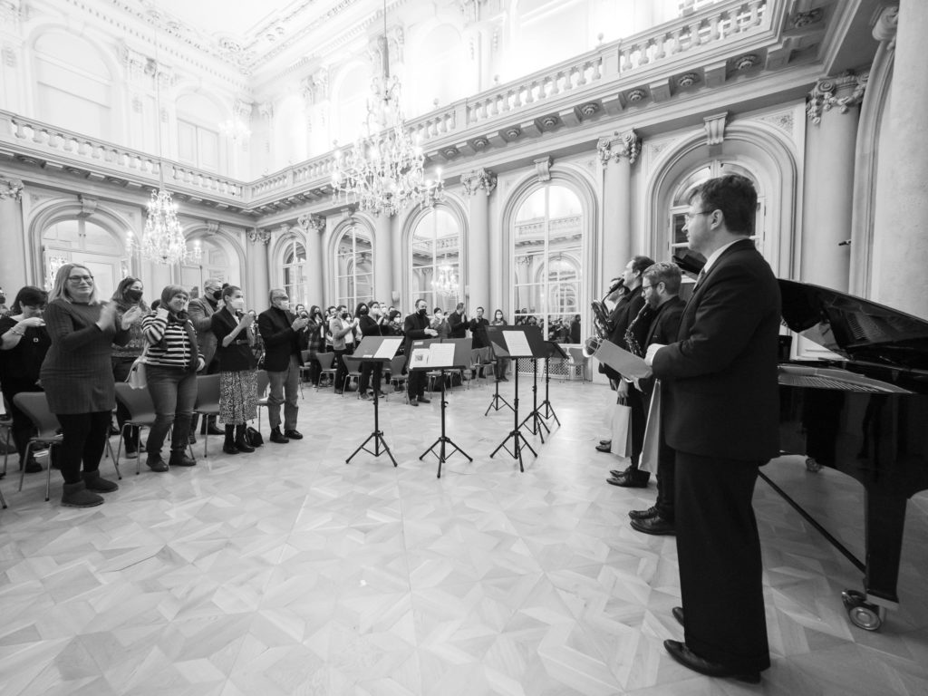 Od majstrovstva kontrapunktu sme sa dostali aj ku klasicizmu – Mozartovmu Kvintetu pre klavír a dychové nástroje KV 452, ktoré znelo v úprave Ladislava Fančoviča. Pomalý úvod predviedol všetky nástroje, pričom pri saxofónoch akoby sme miestami cítili istú príbuznosť s klarinetom, prípadne hobojom. Saxofón je mimoriadne flexibilný hudobný nástroj a vie sa priblížiť k týmto dychovým nástrojom, takže kvinteto znelo plnohodnotne, najmä v jeho druhej, dynamickejšej časti. Exceloval aj klavirista Ladislav Fančovič svojím kultivovaným prednesom, s ukážkovými odťahmi, čistými behmi, priezračne vedenými melodickými úsekmi – Mozart v tomto diele dáva klavír zaznieť.