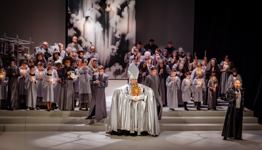 Možno sa zdá, že Scarpiovi venujeme priveľa priestoru, no i z hudobného hľadiska má v partitúre svoje miesto. Na jeho príchod divák čaká podvedome už od „neexistujúcej“ predohry celého operného titulu. V orchestri ho umne predznačil Peter Valentovič sledom troch akordov, ktoré plynulo prešli do prvej scény. Hudba je totižto kľúčom k celému tomuto politickému thrilleru popretkávaného láskou, žiarlivosťou, ale i otázkou viery, ktorá sa zlomená objavuje v mnohých symboloch aj v košickej inscenácii. Ak teda aj nerozumiete libretu (hoci v Košiciach máte k dispozícii po celý čas titulky) hudba je ten kľúč, ktorý vám náladou, leitmotívmi v tomto diele všetko rozpovie jasne a zrozumiteľne.