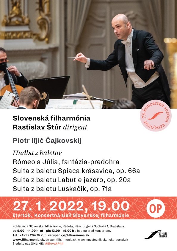 Filharmonici so slovenským dirigentom Rastislavom Štúrom uvedú populárny program - výber z diel Piotra Iľjiča Čajkovského. Na úvod koncertu zaznie fantázia-predohra Romeo a Júlia, v ktorej sa skladateľ zameral na stvárnenie milostného príbehu inšpirovaného nesporne literárnou predlohou, na základe ktorej sa dá ľahko sledovať základnú myšlienku i celkovú atmosféru tohto diela. Nasledovať bude výber častí zo suít z Čajkovského troch baletov - Spiaca krásavica op. 66 (1888-1889), Labutie jazero op. 20 (1875-1876) a Luskáčik op. 71 (1892). Balety preslávili Čajkovského naprieč celým svetom i všetkými generáciami poslucháčov. Rozprávkové námety s magickou atmosférou umocňuje Čajkovského sugestívna hudba, plná melodickej invencie, podmanivého výrazu, farebnej orchestrácie.