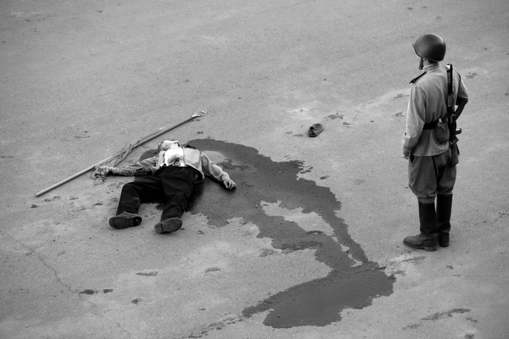 Končalovskij celú absurdnosť dokresľuje drobnými, ale stále zarážajúcimi motívmi, ktoré perfektne ilustrujú zvrhlosť systému, ktorý na 40 rokov ovládol takmer polovicu zemegule. Keďže sa krv obetí pre letnú horúčavu pripiekla k asfaltu a nedá sa zmyť, treba námestie pokryť novou vrstvou asfaltu. A aby mali obyvatelia mesta pocit, že to celé bol naozaj iba zlý sen, zavoláme kapelu a na tom istom námestí sa bude večer hrať a tancovať.