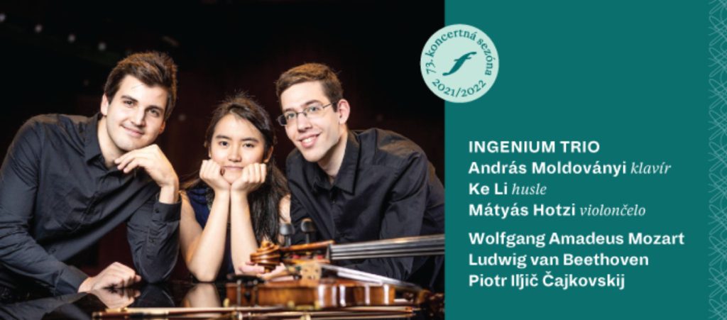 V utorok 16. novembra sa v Malej sále SF predstavia traja mladí interpreti – klavirista András Moldoványi, huslistka Ke Li a violončelista Matyás Hotzi, ktorí spoločne tvoria INGENIUM TRIO. Sformovali ho počas štúdia na budapeštianskej Lisztovej akadémii. Komorné zoskupenie koncertuje po celej Európe a zúčastňuje sa majstrovských kurzov u popredných umelcov. Program koncertu ponúkne Divertimento B dur Wolfganga Amadea Mozarta, Klavírne trio B dur Ludwiga van Beethovena, Elegické trio g mol Sergeja Rachmaninova, Klavírne trio B dur Franza Schuberta a Klavírne trio a mol Piotra Iľjiča Čajkovského, ktoré skladateľ venoval „pamiatke veľkého umelca“ Nikolaja Rubinsteina. Koncert sa začne o 19.00 h.