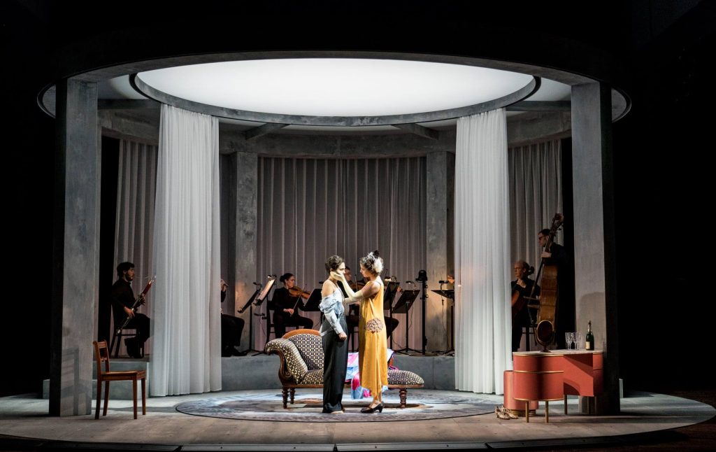 Julie Weideli is a fantastic designer. She made a beautiful set with curtains that we can use in a symbolic way. Because we have the musicians on stage, we use them and their music as emotion (music is emotion of course). So when Violetta wants to let the emotion in (for example, when she is in love in the first act) she opens the inside curtains and we see the musicians. Whe she tries to block her emotions (for example, in the duetto with Germont) she closes the curtains.