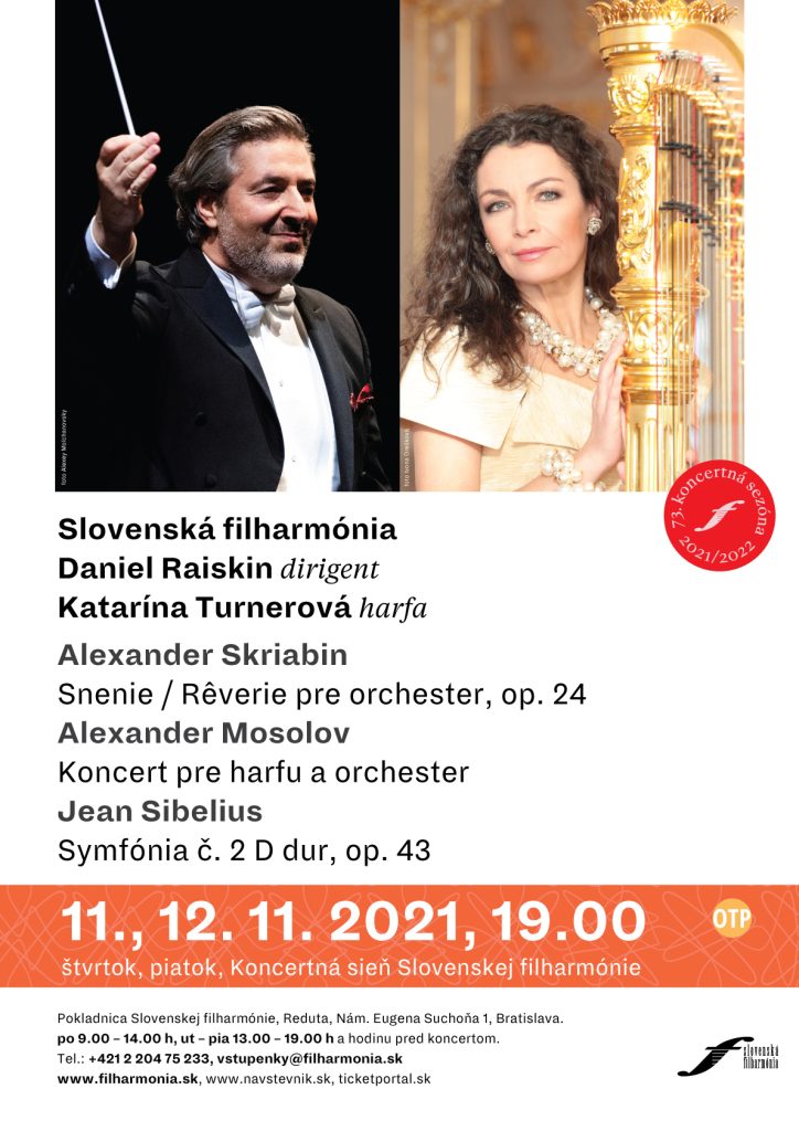 Daniel Raiskin na svojom koncerte v cykle Hudba troch storočí predstaví originálnu koncertu dramaturgiu. V jej centre bude Koncert pre harfu a orchester Alexandra Mosolova, ktorý zaznie v interpretácii Kataríny Turnerovej, ktorá je členkou Slovenskej filharmónie od roku 1995. Okrem toho pravidelne koncertuje doma i v zahraničí ako sólistka aj ako komorná hráčka. Je absolventkou žilinského Konzervatória a Akadémie múzických umení v Prahe.