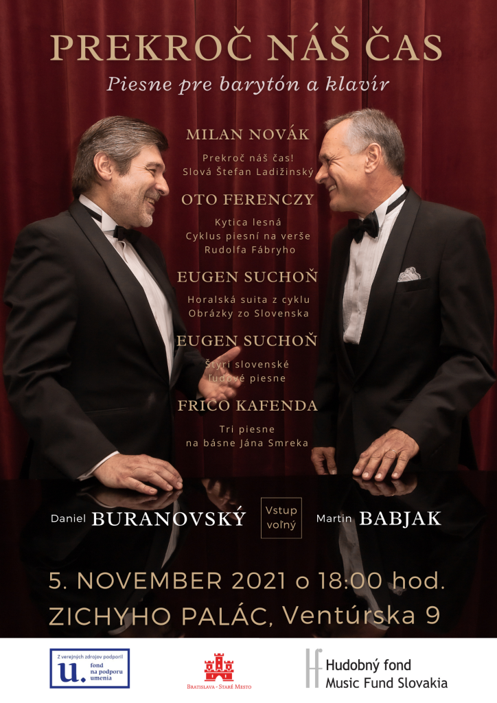Počas výnimočného večera zaznejú piesne významných slovenských skladateľov, ktorí pôvodnú slovenskú tvorbu v oblasti klasickej hudby pozdvihli na vysokú umeleckú úroveň. Ich tvorba sa stala pevným základom pre rozvoj ďalších generácií slovenských skladateľov. Objavte už dnes spoločne s operným spevákom Martinom Babjakom a klaviristom Danielom Buranovským diela Frica Kafendu, Eugena Suchoňa, Ota Ferenczyho a Milana Nováka.