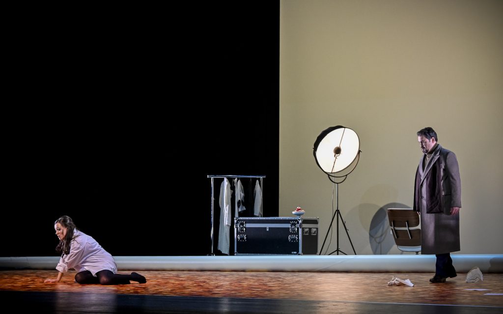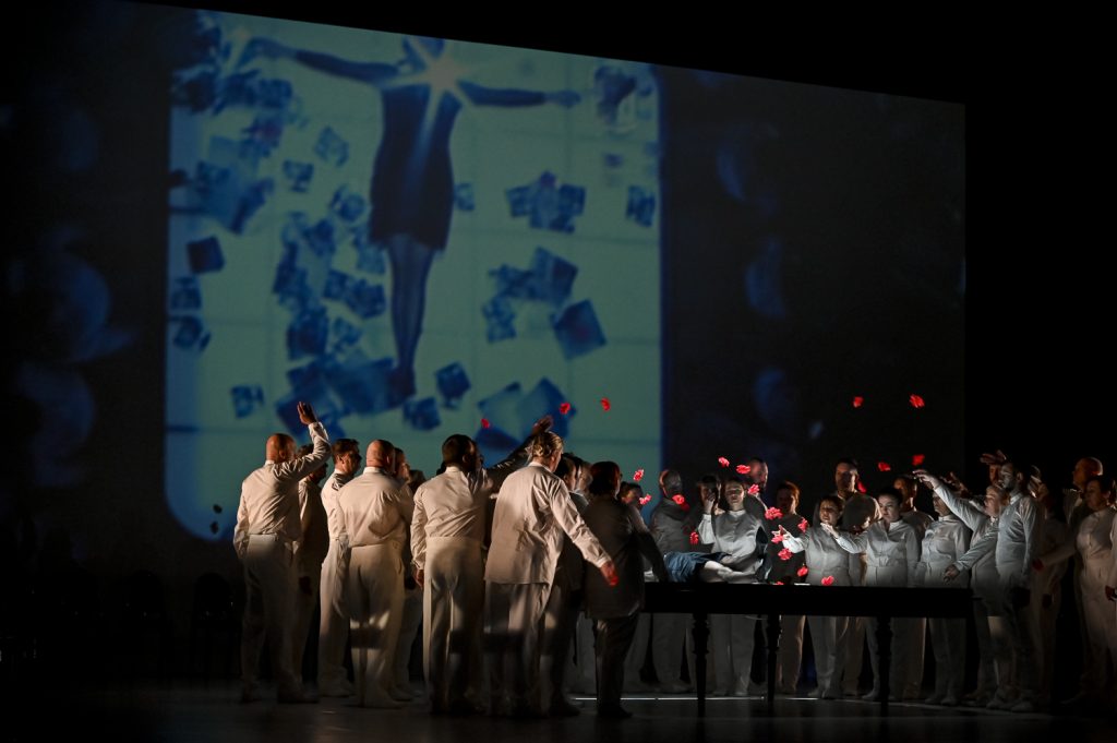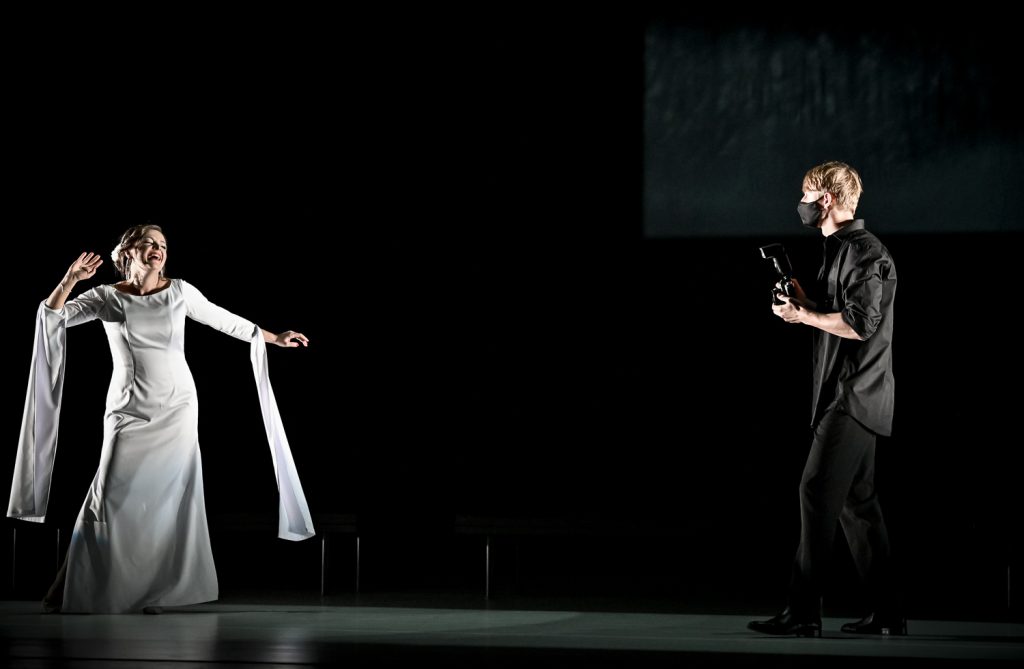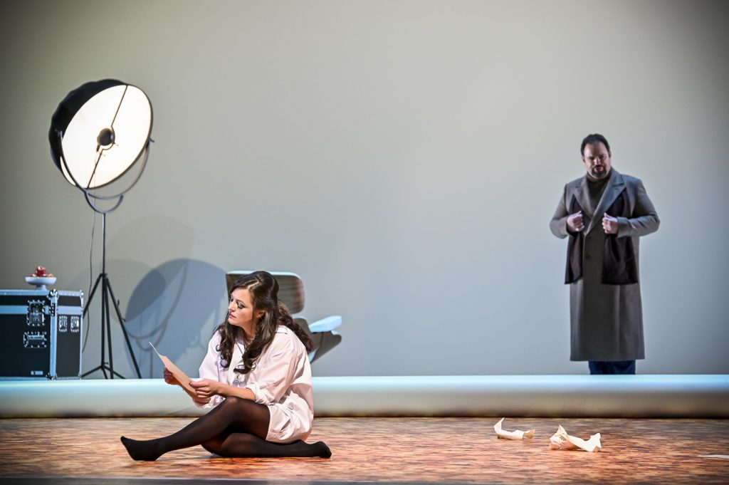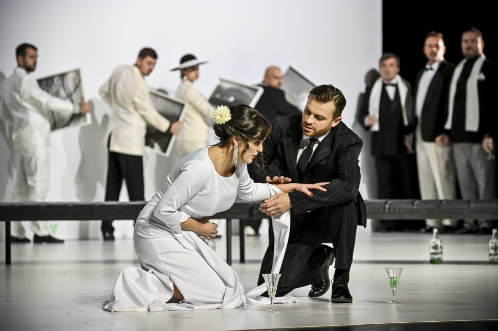 Robert Jindra je vyštudovaný spevák, veľmi dobre teda pozná nielen silné, no i slabé stránky spevákov, preto presne vie, kedy má orchester prispôsobiť sólistom, aby ich nechal vyniknúť – či už z hľadiska tempa alebo dynamiky. A v tomto prípade dochádzame k základnej trhline Traviaty v réžii talianskeho tvorcu Roberta Catalana a jeho tímu. Už počas znejúcej predohry bolo zrejmé, že ponúkol divákom moderne spracované, krásne čisté, minimalistické dielo – na tom by nebolo nič zlé, naopak, takýto operný kus si v súčasnosti priam vyžaduje nového, sviežeho ducha a revolučný prístup. A ten režisér so svojim tímom nepochybne má. Na prázdnej scéne (scéna Emanuele Sinisi) sme videli jedinú lavicu a Violettu Valéry (Mariana Sajko) v dlhej bielej róbe (kostýmy Iliaria Ariemme), s čím korešpondovalo aj studené biele svetlo (svetelný design Fiammetta Baldiserri). Violetta sa ocitá pred objektívom – zrazu sa divákovi vyjasní, čo znamená v obsadení postava Fotografa (Juraj Bendik).