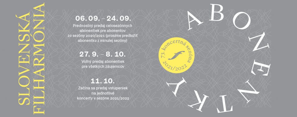 V týchto dňoch si môžu prednostne zakúpiť ABONENTKY naši stáli návštevníci, abonenti z minulej koncertnej sezóny 2020/2021. Prednostný predaj potrvá do piatka 24. septembra. (Prosíme predložiť abonentku z minulej sezóny).
