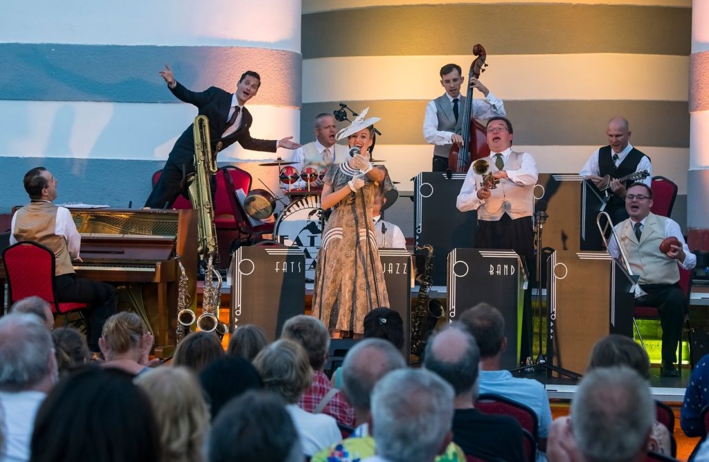 FATS JAZZ BAND interpretuje túto hudbu na originálnych historických hudobných nástrojoch a v dobovom oblečení. Vďaka dokonalej autentickosti sa duchom ihneď prenesiete do obdobia, ktoré bolo plné elegancie, glamour rób a štýlových večierkov. Orchester pravidelne účinkuje na zahraničných festivaloch (Česko, Rakúsko, Maďarsko, Poľsko, Nemecko, Chorvátsko, Gruzínsko, Francúzsko, Dánsko či Taliansko) a od svojho vzniku odohral na domácich aj zahraničných pódiách vyše 400 koncertov.
