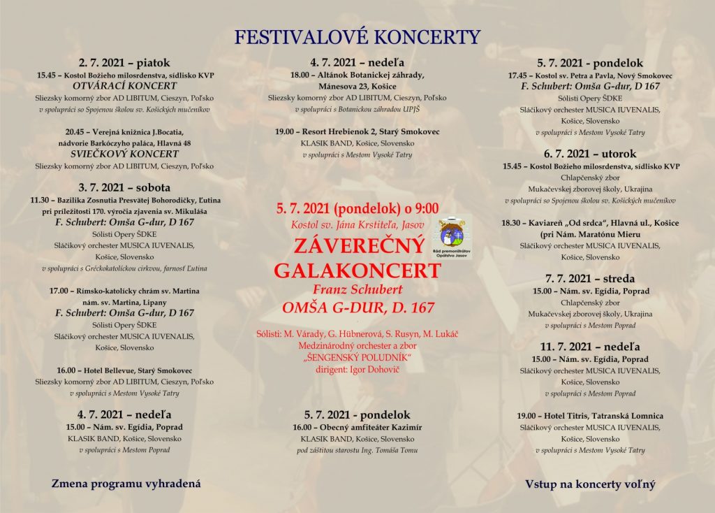 Na záverečnom galakoncerte, ale aj na niektorých ďalších koncertoch vrátane koncertu na pútnickom mieste v Ľutine, zaznie v tomto roku ďalšia z výnimočných vokálno-inštrumentálnych skladieb svetovej hudby, OMŠA G-DUR Franza Schuberta. Sólistami budú Michaela Várady, Gabriela Hübnerová, Stanislav Rusyn a Marián Lukáč zo Štátneho divadla Košice. Na galakoncerte ich bude sprevádzať Medzinárodný orchester a zbor Šengenský poludník, na ďalších miestach organizátor festivalu Musica Iuvenalis, vždy pod taktovkou Igora Dohoviča.