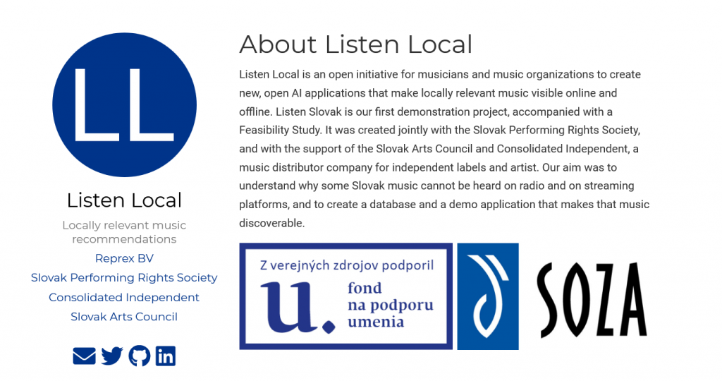 Riešením tohto problému by mohla byť aplikácia Listen Local vybudovaná na komplexnej referenčnej databáze slovenskej hudby. Cieľom tejto aplikácie je objavovať a odporúčať v rámci veľkých digitálnych platforiem viac slovenskej hudby rôznych žánrov počnúc popom, rockom až po jazz či klasickú hudbu. Cez aplikáciu Listen Local si poslucháči vyhľadajú umelcov a kapely na základe svojho vkusu, ale aj na základe toho v akom meste sa nachádzajú. Poslucháč si môže cez aplikáciu jednoducho vyhľadať hudbu umelcov pochádzajúcich z jeho rodného mesta, či z mesta, ktoré sa práve chystá navštíviť.
