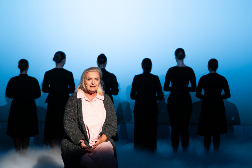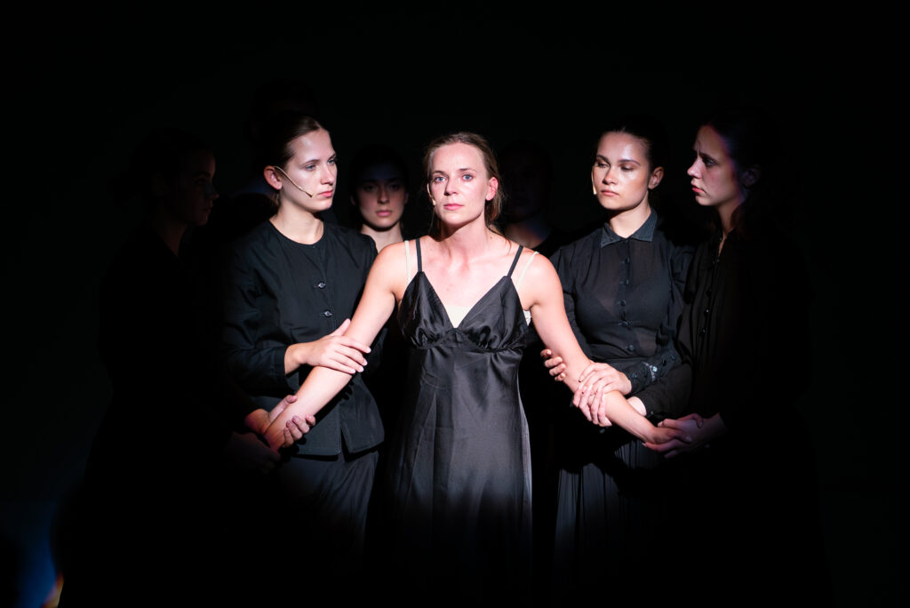 Na diele sa okrem už spomínaných výrazne podieľajú aj poslucháčky Súkromného konzervatória v Nitre, ktoré vytvárajú kolektívny ženský zbor. Ich neustála prítomnosť, presne vedená choreografia a pohybová štylizácia (autorka Katarína Melcherová) dotvára minimalistickú scénu, pozostávajúcu z bieleho baletizolu, drevených stoličiek, kožených kufrov a premietacieho plátna. V ich pohyboch sa opakovane objavuje motív premeny – nie len fyzickej, ale aj identitárnej. Stávali sa vojačkami, židovkami, kamarátkami, tichými svedkyňami udalostí – vždy podľa potreby konkrétneho príbehu, pričom všetky tieto roly sú v ženskej vojnovej skúsenosti potenciálne prítomné. Roly sa medzi nimi prirodzene prelievajú a zvolené čierne kostýmy, nesúce v sebe istú anonymitu, či neutralitu, podporujú prenášanie významov z jednej postavy na druhú a znásobujú ich vzájomnú zameniteľnosť.