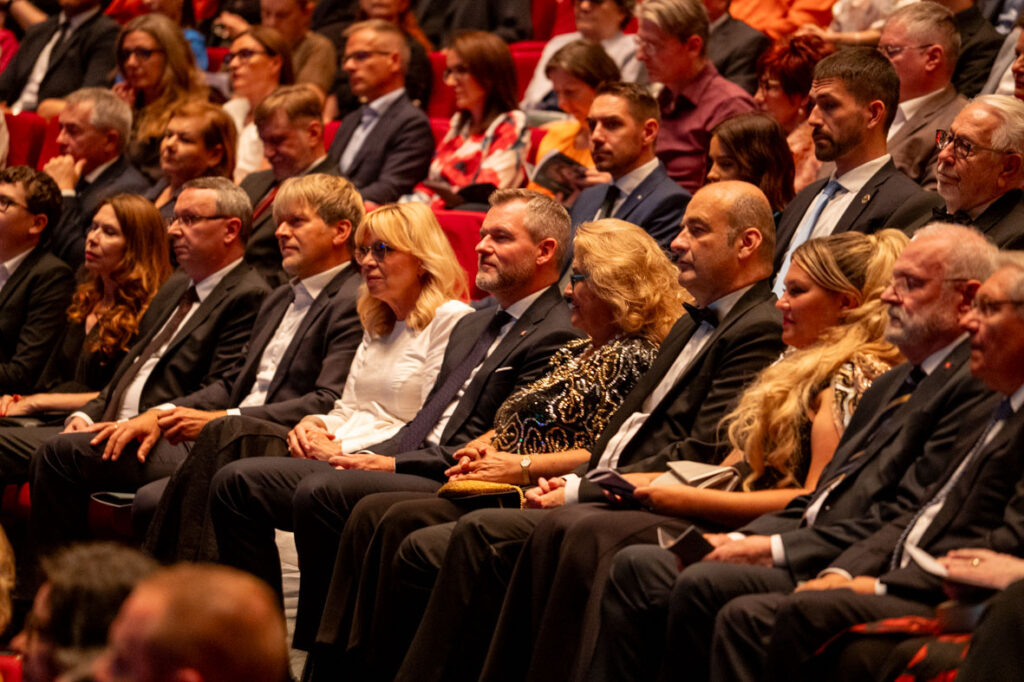 Generálna riaditeľka SND Zuzana Ťapáková privítala vzácnych hostí, prezidenta Slovenskej republiky Petra Pellegriniho aj bývalého prezidenta Ivana Gašparoviča a mnoho osobností zo všetkých sfér nášho spoločenského života.