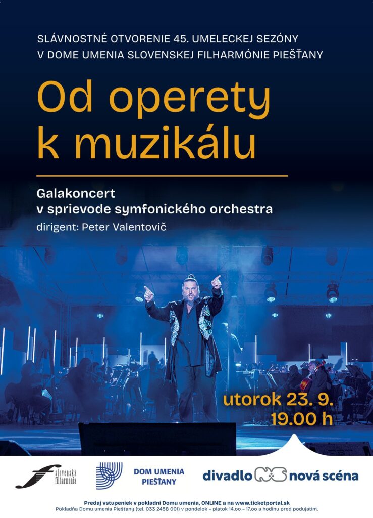 V utorok 23.9. o 19.00 hod. budú v ikonickej budove legendárneho architekta Ferdinanda Milučkého v Dome umenia znieť slávne melódie svetovej operetnej tvorby autorov Franza Lehára (Veselá vdova), Emmericha Kálmána (Čardášová princezná, Grófka Marica, Vojvodkyňa z Chicaga) a zaznejú aj hudobno-spevácke party legiend muzikálového neba ako sú Cats, Bedári, Fantóm opery, Mojžiš, Mamma mia! a ďalších muzikálov.
