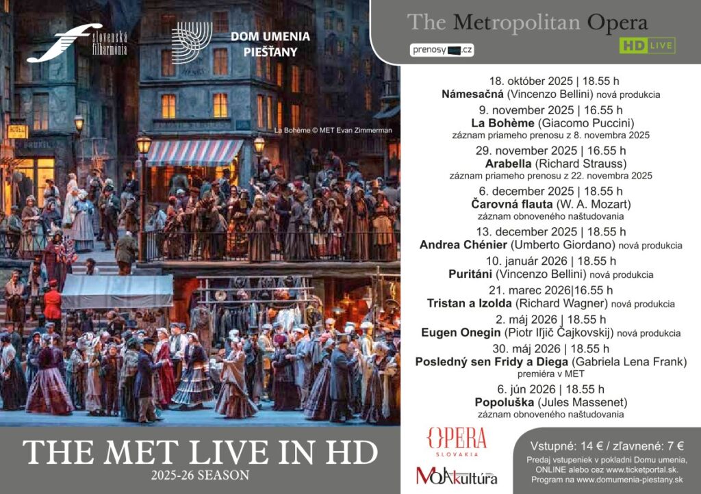 Dom umenia Piešťany aj v novej sezóne prináša divákom jedinečnú možnosť zažiť čaro svetovej opery priamo z legendárnej Metropolitnej opery v New Yorku. Prostredníctvom obľúbených priamych prenosov si môžete vychutnať nové inscenácie, hviezdne obsadenia i nezabudnuteľné hudobné zážitky.