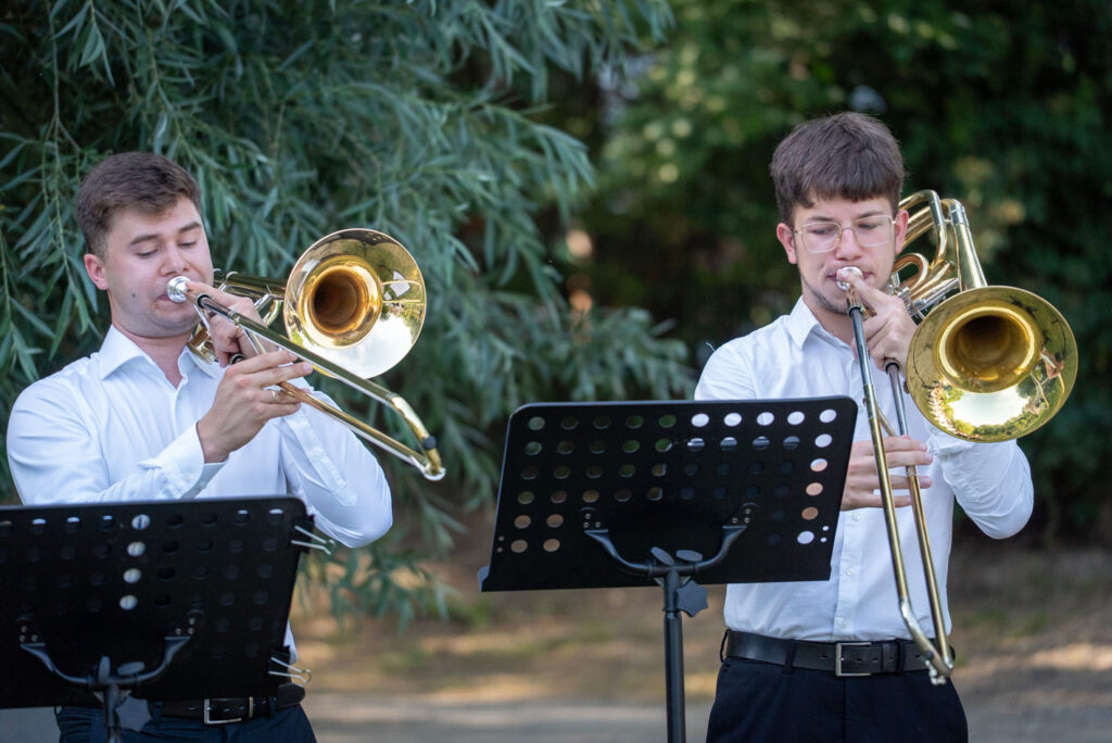 Program otvorilo dielo Claudia Monteverdiho – jeho Toccata znela v precíznej stavanej terasovitej dynamike, s jednotným frázovaním, bolo ihneď zrejmé, že hudobníci majú tento repertoár spoločne dobre nacvičený a dbajú o výrazové nuansy štýlovo čistej interpretácie. Aj keď hrali v exteriéri, ktoré pre akékoľvek dychové nástroje znamenajú sťažené podmienky, ich ladenie bolo mimoriadne čisté. Teleso s umeleckým vedúcim, trubkárom Tomaszom Słusarczykom, personálne tvorili: ďalšie dve trúbky - Artur Kowalczuk, Julian Pipitsanu, tri pozauny - Szymon Klimański, Artur Pudło, Andrzej Tkaczyk a tympany a perkusie - Bartosz Sałdan. Hráči uchvátili disciplínou a kultivovaným, homogénnym zvukom. Dosiahnuť v trojici trúbok a trojici trombónov takú vyváženosť, je na Slovensku raritné. Fanfárovitý kus úvodom nebol charakteristický „dychovkou“, ale precíznosťou a vypracovaným, mäkkým, ušľachtilým tónom.