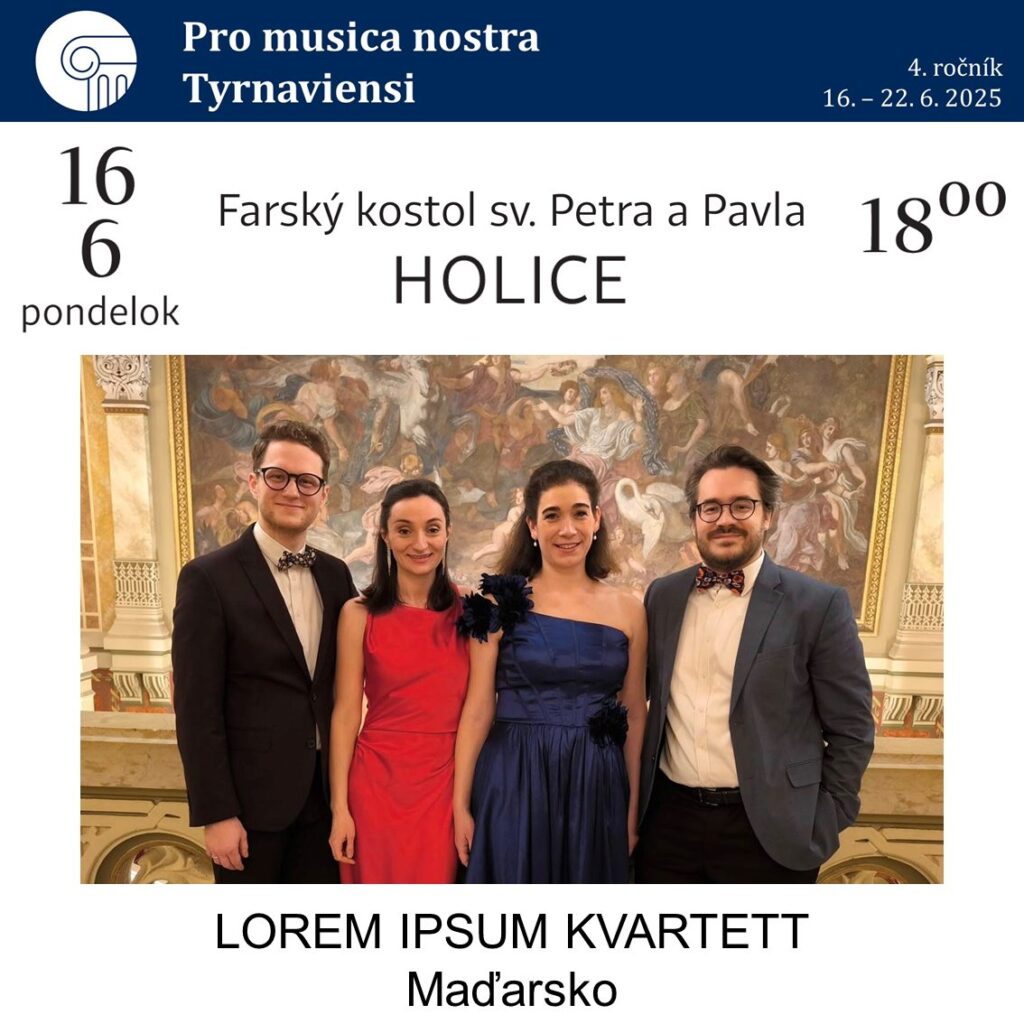 Június 16-án a szlovákiai Holicén, a Szent Péter és Pál-templomban adnak koncertet. Ez egy gótikus műemlék, amelynek eredete az 1270-es évekre nyúlik vissza. Ez a falu egyik gyönyörű nevezetessége – a fesztivál célja, hogy templomokban, kápolnákban, műemlékekben, várakban és kúriákban mutasson be zenét, és az ezt figyelembe véve választanak együtteseket, alakítják a programot. Gazdagítja-e kvartettjüket, hogy ilyen terekben lépnek fel, és egyúttal felfedeznek egy darabka történelmet?