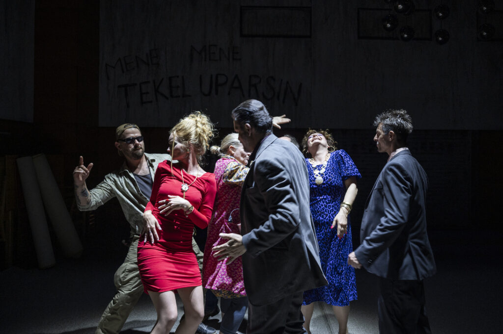 A v skutku sa ocitáme v kultúrnom dome z čias socializmu kdesi na vidieku, hoci pokojne by to mohol byť aj bratislavský Zrkadlový háj, alebo DK Ružinov (scéna Matúš Ďurian). Uniformná architektúra interiéru, nevábny nábytok sedemdesiatych rokov dvadsiateho storočia, retro svietidlá a centrálny visiaci dekoratívny objekt súboru kovových gúľ, charakteristický pre tento typ kultúrnych zariadení osemdesiatok minulého storočia. V kúte prenosný, pravdepodobne čiernobiely televízor, po stranách zvinuté červené koberce, ktoré sa neskôr použijú spolu s nábytkom na kreovanie volebnej miestnosti. Druhá časť scénu výrazne nezmení, pridá sa pódium a raster stoličiek (priestor na ochotnícke divadelné predstavenie). Na zadnom horizonte je spúštacia mreža garáže (akási stále polozatvorená vstupná brána, alebo únikový východ). V rohoch miestnosti sú nízko nad podlahou situované portály, ktorými postavy nepohodlne vstupujú, aj odchádzajú štvornožky prikrčené ako tunelom (symbolicky ako potkany, resp. exempláre s pokrivenou chrbtovou kosťou a charakterom). Vizuálnu stránku priestoru kreuje aj svetlo (svetelný dizajn Dominika Katonová), ktorý konštantne presvetľuje scénu, intimizuje ju len v občasných situáciách (evanjelický farár Kozák na konci prvej časti so svojou skľučujúcou „správou“ o slovenskom národe), alebo s použitím stroboskopu pri dynamických pohybových sekvenciách skupiny takmer všetkých postáv. Kostýmy (Katarína Hollá) majú civilný charakter vtedajšej súčasnosti socialistických rokov, avšak bez výrazných znakov, skôr s indiferentnými prvkami vidieckeho vkusu, ktorý by sme našli v realite aj dnes, plus s presahom aj do momentálnej súčasnosti (hlavne v postave Vybubnovanej - manželky starostu s častým leopardím vzorom na šatách a malomeštiackej načančanosti v detailoch). Výtvarné znenie scény aj kostýmov nás síce vracia do nedávnej minulosti socializmu a zároveň svojou pretrvávajúcou existenciou desivo naznačuje, že sa toho zas tak veľmi nezmenilo. Časovú prítomnosť vskutku signalizujú len mobilné telefóny, ktoré postavy používajú na selfie a na natáčanie kompromitujúcich situácií na následné prípadné vydieranie. Vlastne sa v princípe nič nezmenilo, v charakteroch, správaní, machináciách, špekuláciách, intrigách, v používaní moci, v rozdieloch medzi chudobnými a bohatými od čias Záborského v devätnástom storočí, cez socializmus až po súčasnosť. Akoby sa v čase posúvali iba technológie, ktoré, paradoxne, a príznačne generujú ďalšiu (a vyššiu) úroveň osobného aj spoločenského nebezpečenstva.
