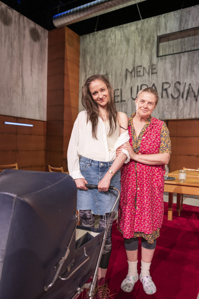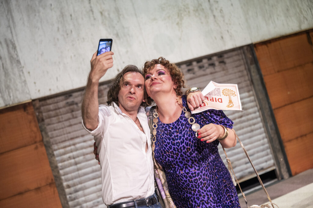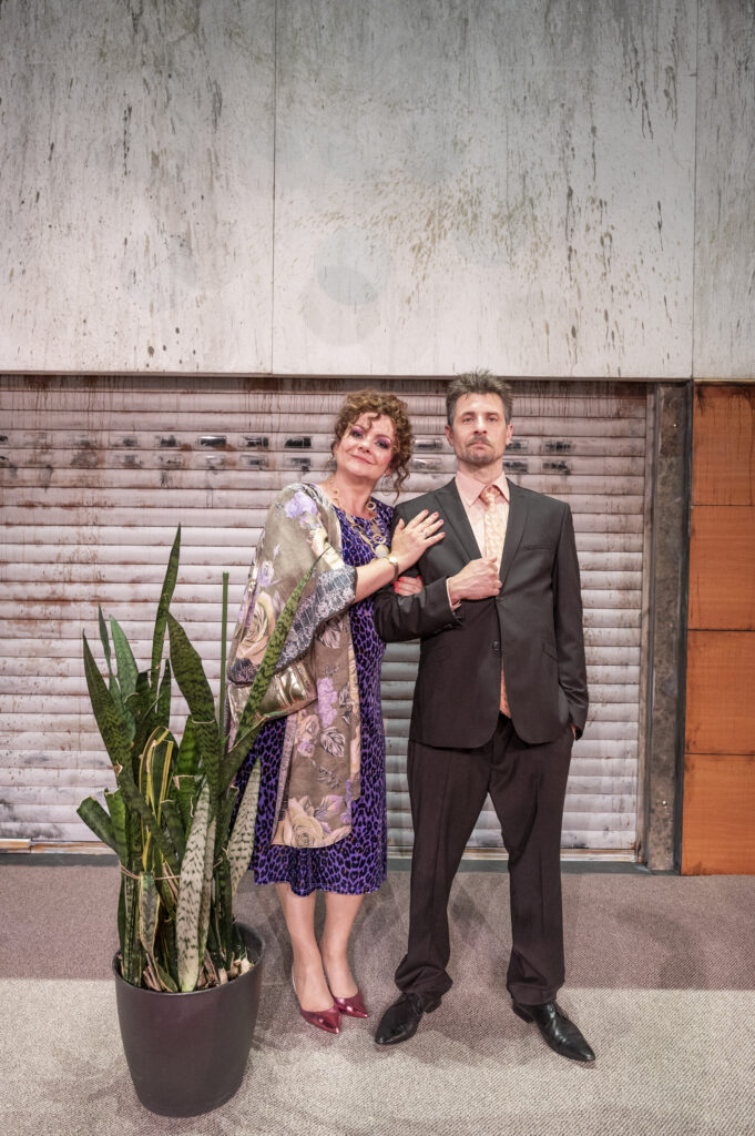 Rovnako sympaticky zarezonovala Agáta Spišáková, vdova Rojkovička, ťažiac aj z nevábneho outfitu a primitívnej, ale ráznej rozhodnosti postavy. Eva Sákalová v postave dominantnej a zľahka unudenej Sajhy, manželky starostu v Hahure, sa mohla plne spoľahnúť na výrazný styling, driečnu postavu a fragmentárny komický prejav, hlasovo za svojimi kolegami pomerne zaostáva (nie je ju dobre počuť), hoci je ju výrazne vidieť. Rojkovičovej dcéra Maňuša, (v podaní Evy Mores) okolo dieťaťa ktorej sa celý dej točí, je zahraná snaživo až premotivovane (zdá sa, že jej viac sedí kamera, než javisko). V kočíku má (a často nemá) Najdúcha - áno je to jej Najdúch, ktorého splodila s nádejným starostom Gejzom a prišla mu na voľby robiť problémy, je to TO dieťa, ktorého si postavy pohadzujú, ktoré nepatrí nikomu a patrí všetkým – synonymum krajiny, aj budúcnosti, reprezentant našej minulej aj súčasnej reality. Zámerne som si na koniec nechala highlight celej inscenácie v rámci herectva, manželku starostu v Chujave, Vybubnovanú, v skvelej interpretácii Anikó Vargovej. Postavy sa niekoľkokrát dožadujú v scenári autentickosti, autentickosť ako povahová črta je tu vtipne povyšovaná na piedestál, akcent na populárnu autentickosť je posunutý do humornej roviny. Ak tu však vskutku je niekto naozaj herecky autentický, tak je to rozhodne Anikó Vargová vo svojej hereckej plnokrvnosti a živočíšnosti. Trochu akoby vo vizuálnych súvislostiach „vypadla“ z retro seriálu Sľub, len má vyššiu „hodnotu“ ako manželka starostu a okázalejší kostým s leopardím motívom. Svojim spôsobom práve ona drží herectvom inscenáciu „nad vodou“.