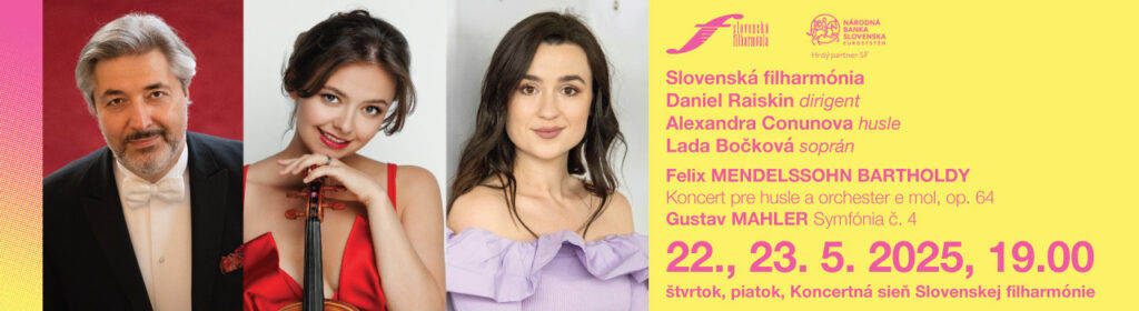 Májová symfonická dvojica koncertov šéfdirigenta Daniela Raiskina je na programe vo štvrtok a piatok 22. a 23. mája 2025 o 19.00 h. Po boku orchestra Slovenská filharmónia sa debutovo predstavia huslistka Alexandra Conunova a sopranistka Lada Bočková. V Koncertnej sieni Slovenskej filharmónie zaznejú diela dvoch skladateľov – Felixa Mendelssohna Bartholdyho a Gustava Mahlera.