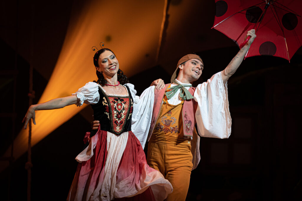 Na jednoduchej, efektnej scéne Milana Ferenčíka vo farebných kostýmoch Josefa Jelínka sa toho udeje veľa veselého, vtipného i dojemného, ako to už v živote býva... a všetko je rozprávkovo krásne – šmykľavka z listu, veľké hroznové bobule i nebezpečné pavučiny, medzi ktorými lietajú baletní chrobáčikovia a iné lesné stvorenia. A členovia Baletu SND si naplno užívajú toto radostné šantenie, ktorého energiu prenášajú do hľadiska.