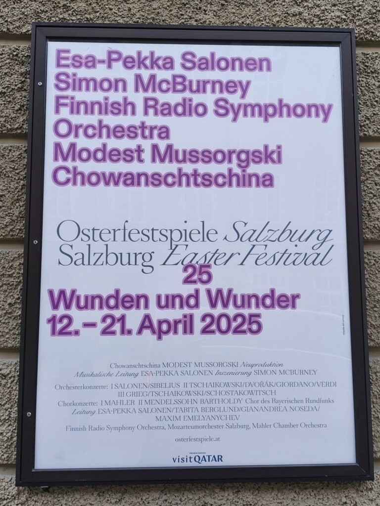 Veľkonočný festival v Salzburgu každoročne začína v sobotu pred Kvetnou nedeľou a končí na Veľkonočný pondelok. Tohtoročný 59. ročník sa uskutoční od 12. do 21. apríla 2025 a ponúkne rozmanitý program s názvom „Rany a zázraky“. Po prvýkrát v histórii festivalu sa tu tento rok predstavia tri špičkové orchestre: Symfonický orchester Fínskeho rozhlasu, Mahlerov komorný orchester a Mozarteum orchester. Stredobodom festivalu bude nová inscenácia opery Modesta Petroviča Musorgského Chovanščina s našim úspešným Slovenským filharmonickým zborom.
