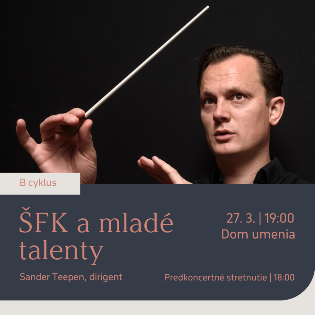 Koncert z abonentného cyklu B s názvom ŠFK A MLADÉ TALENTY sa uskutoční vo štvrtok 27. marca 2025 o 19:00 v Dome umenia. Cena vstupného je 14/11/8 €, v lóži 18 €. Na predkoncertné stretnutie o 18:00 v Malej sále sa dostanete s abonentkou alebo vstupenkou na večerný koncert. ŠFK pripravila aj verejnú generálku, vstupné je 7 €, zľavnené 5 €. Vstupenky na podujatia ŠFK sú v predaji aj so zľavami 30 percent vo vstupenkovej pokladni Domu umenia od pondelka do štvrtka (10:00 – 12:00, 14:00 – 17:00) a hodinu pred podujatím, ako aj online na webe www.sfk.sk.