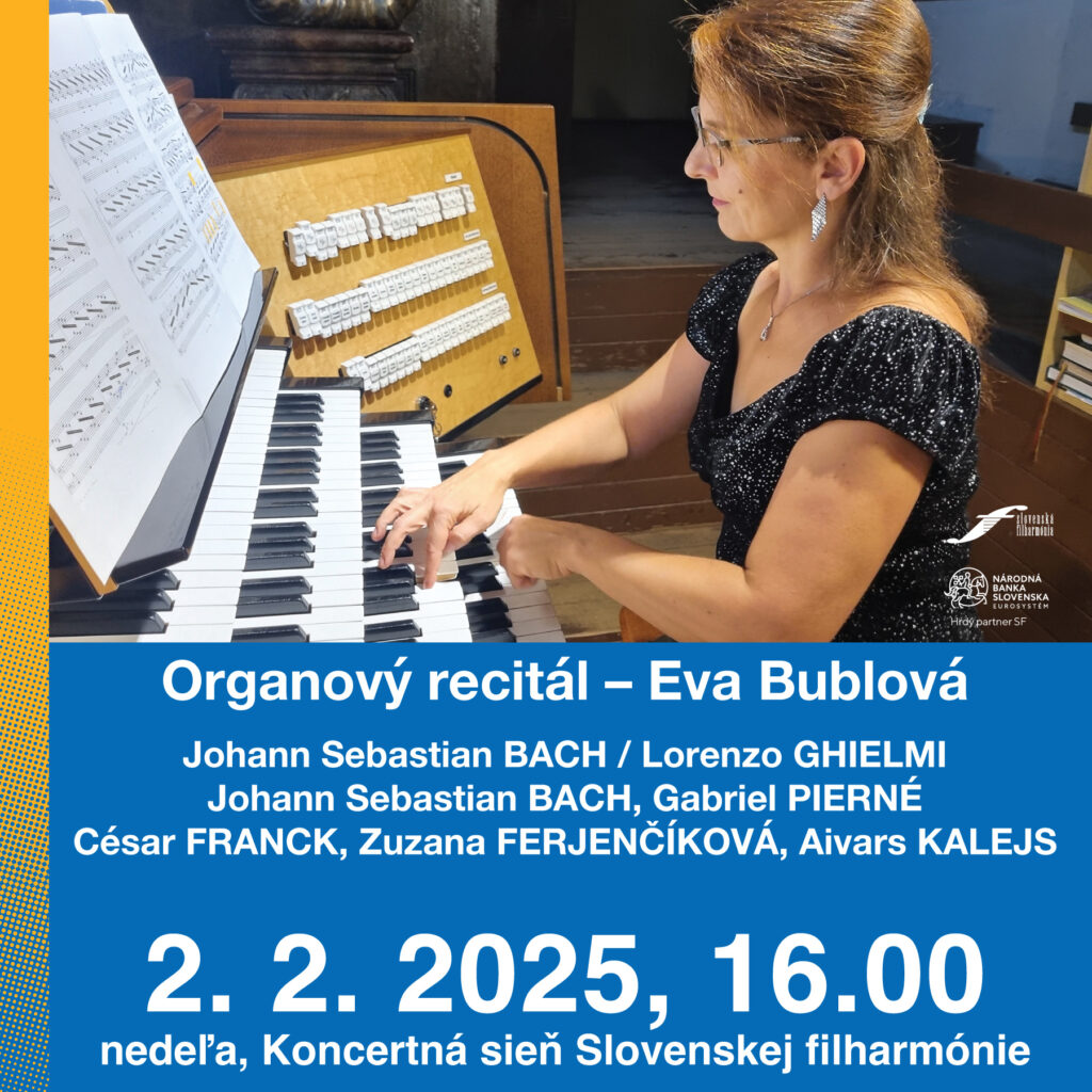 Eva Bublová sa tentokrát predstaví s bohatým repertoárom. V prvej polovici koncertu vzdá poctu jubilujúcemu Johannovi Sebastianovi Bachovi. Druhá polovica recitálu sa bude niesť vo francúzskom duchu. Veľkolepá Fantázia A dur Césara Francka pochádza z cyklu Trois Pièces. Do dejín francúzskej organovej kultúry patrí aj skladateľ, dirigent a organista Gabriel Pierné, od ktorého zaznie časť Prélude z jeho najuvádzanejšieho diela Tri skladby pre organ, op. 29 z roku 1892. Francúzske kompozície budú doplnené o mladšie skladby organistov a skladateľov – Perpetuum mobile lotyšského organistu, klaviristu a skladateľa Aivarsa Kalējsa, ktorý pôsobí ako koncertný organista v Kostole sv. Gertrúdy a v Katedrále v Rige. Vystrieda ho Signum magnum Zuzany Ferjenčíkovej, venované Eve Bublovej, ktorá ho v roku 2014 premiérovo uviedla v rakúskom Heidenreichsteine a odvtedy sa pravidelne objavuje v jej koncertných programoch.