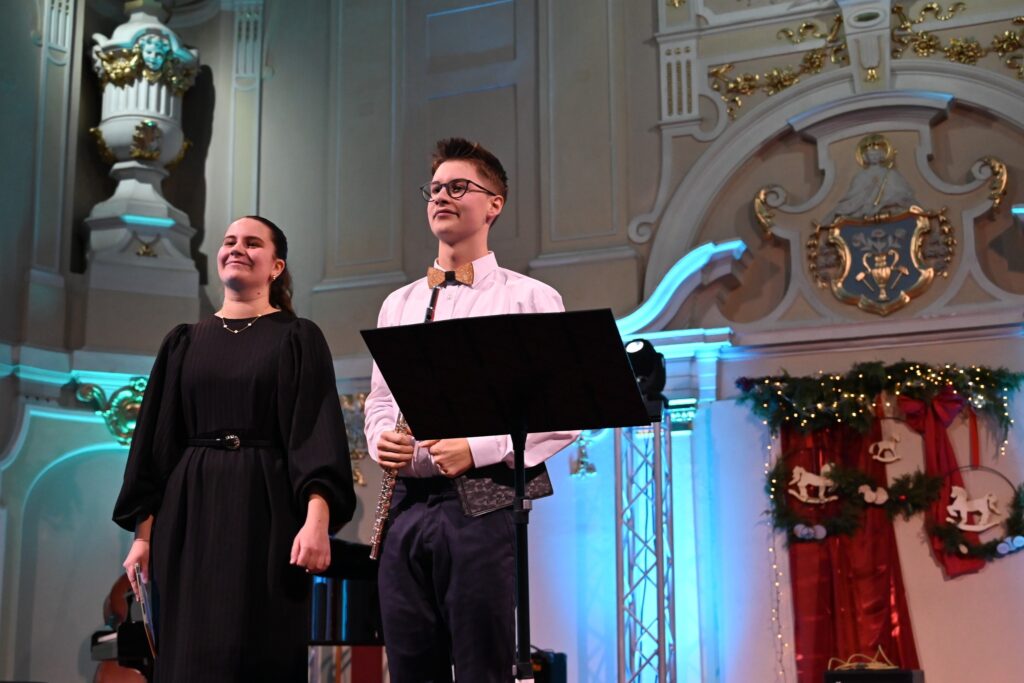 ZUŠ SNV má veľkú silu a potenciál šikovných žiakov, keď dokáže na jednom koncerte zostaviť hneď niekoľko telies. Komorný flautový súbor, ktorý vedie Mgr. Denisa Kotradyová, DiS. art. interpretoval koledy – Dobrý pastier, Veselé vánoční hody, Štedrý večer nastal. Celkovo jedenásť flautistiek (z nich jeden chlapec) hralo koledy s precíznymi rytmickými nástupmi a mimoriadne pekne tvarovanou melodikou. Žiaci preukázali zmysel pre spevnosť a dôslednú legatovú hru.
