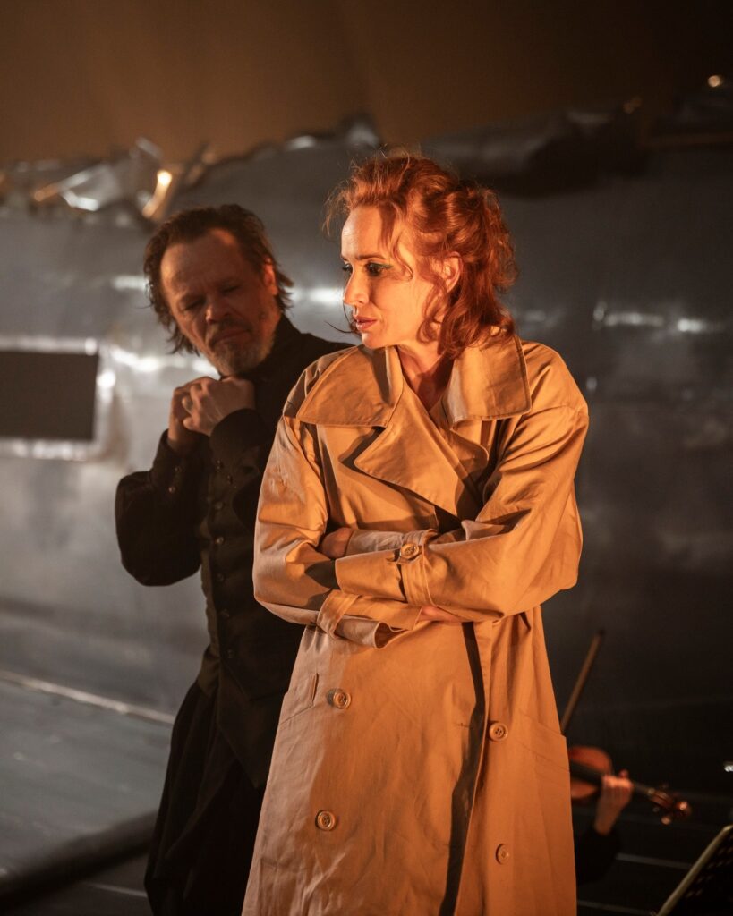 A vskutku „prevtelenie“ lásky minulej do prítomnej asi najvýstižnejšie definuje režisérov zámer. Inscenácia akoby nemala čas. Spočiatku nie je celkom isté, či sme na mieste činu (inscenácia začína projekciou jadrového výbuchu, záznamu atómového hríbu a v priebehu hry sa v projekcii vrátime aj na výsledok tohto útoku – dokumentárnych fragmentov mŕtvych a zranených na uliciach a v provizórnych nemocniciach). V centre javiska je diagonálne situovaný vrak bombardéra, spoza neho sa dramaticky dymí, v improvizovanej malej jame, ergo v prepadlisku, hrá sláčikové kvarteto, akoby sedelo v krátri po výbuchu (jemne evokuje hrajúcu kapelu z potápajúceho sa Titaniku). V zhlukoch sústredené gumáky, ktoré neskôr herečka rozmiestňuje po scéne, desivo navodzujú dojem pozostatkov zmiznuvších po výbuchu. Kufor plný šiat je zdrojom rôznych herečkiných prevlekov priamo pred očami divákov, zavesená uniforma sestričky Červeného kríža naznačuje jej rolu, ktorú prišla zahrať v koprodukčnom filme. V oknách lietadla sa občas mihne priemet z rýchlovlaku, alebo portréty milencov.