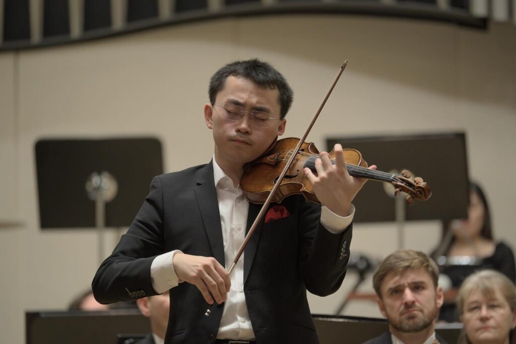Nasledovala skladba, ktorú tiež nepočúvame v našich koncertných sálach tak často. Nejde ani tak o jej kvality, ako mimoriadnu technickú náročnosť a ako sa s obľubou hovorí, pre huslistov je toto dielo výzvou. V interpretácii hosťujúceho sólistu Ziyu He sme počuli Koncert pre husle a orchester, op. 15 Benjamina Brittena, inšpirovaný husľovým koncertom Albana Berga. Dvadsaťpäťročný rakúsko-čínsky huslista neprekvapil, v žiadnom zmysle slova. Prvá časť koncertu začína nezvykle – perkusiami: tympanmi a činelom, s rytmickým vzorcom, ktorý následne počujeme v ďalšej nezvyklej inštrumentácii (fagot a harfa). Nie je to však technika seriálnej hudby, ktorú využil, nie je ani romantický. Brittena s Bergom spája skôr hudobná forma, výstavba a charakter tém. K prvej vrúcnej, oduševnenej téme, neskôr v kontrastnej plachej boli obaja skladatelia inšpirovaní osudom postavy Manon Gropius. Bola dcérou nemeckého architekta Waltera Gropiusa a Almy Mahlerovej a nevlastnou dcérou básnika Franza Werfela a zomrela v mladom veku 19 rokov. Je to téma prestúpená smrťou a krásou zároveň – v hudobne intenzívnom koncerte celý čas pociťujeme smrť, hlbokú lyriku, ale i hravosť. Intonačne bol Ziyu He čistý, nezápasil ani vo vysokých polohách. Nezneli tenzne, tak v pomalom tempe, dlhé tóny, ako rýchla, kontrastná časť. No predsa. V prvej časti cítime vnútorný nepokoj i zápas. Tak, ako chýbala hĺbka lyriky v úvodnej téme (aj keď pekne zahratej, vycítili ste z frázovania, že je to dôsledok brilantnej prípravy, nie vnútorného prežívania), postrádali sme emocionálny obsah jeho interpretácie. Zvuk huslí bol pekný, kultivovaný, no vnútorný nepokoj chýbal, respektíve, bol málo intenzívny. Rovnako tak tretí motív, ktorý sa objavuje v prvej časti diela – ide o duet medzi sólovými husľami a tympanmi (bez návratu úvodnej lyrickej témy). Chýbala rytmická energia, typická pre tento part, okrem toho tomuto huslistovi nemožno nič vytknúť.
