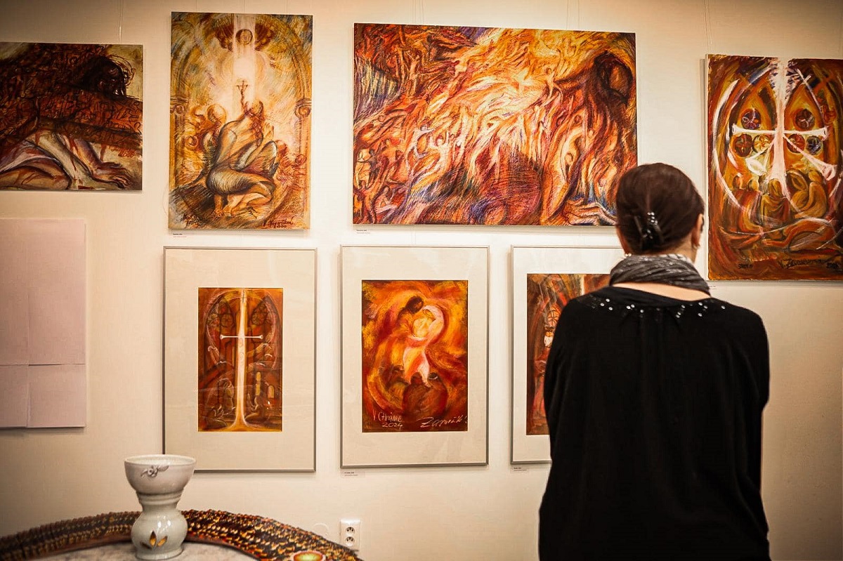 Sú tu obrazy, ktoré som vytvorila v roku 2000 a ešte skôr. Potom bolo veľká prieluka, celých 24 rokov. Za posledný mesiac som vytvorila 12 nových obrazov, ktoré sú tu tiež vystavené. Plánovala som to až v roku 2025, no povedala som si, že neviem čo bude budúci rok. Výstavou som chcela umocniť to, že budem oslavovať životné jubileum 70 rokov a naša škola bude mať tiež svoje výročie. Chcela som Kráľovi pokoja a lásky poďakovať za takmer 25 rokov od založenia školy.