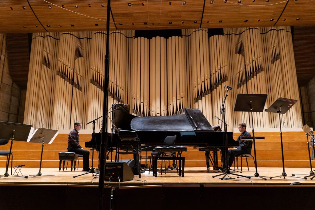 Koncert pre dva klavíry a bicie nástroje ovládané klaviristami je podobne ako v prípade skladby Text rhapsody, komorným prepisom Malého koncertu (s veľkými gestami) pre dva klavíry a orchester z roku 2022. Esencia trojčasťovej formy koncertu sa tu pretavuje do jednoliateho celku, pričom introdukciou je fenomén sprevádzajúci hudbu už po stáročia, ladenie orchestra. Po búrlivom úvode stupnicových behov rôznych prostredí, zaznie ten magický a mol, znak, že o chvíľu sa na pódiu bude niečo diať. Po repetícii tejto introdukcie mierne obmenenej v rámci bicích nástrojov a následnom kratučkom fragmente introdukcie, zaznieva téma založená na repetitívnosti doplnená o zaujímavé harmonické kadencie. Silná emočnosť sa napríklad prejaví aj v pohybe paralelných intervalov a na to nadväzujúcej impresionistickej zvukovosti. Premenlivé striedanie nálad indikuje potrebu technickej vyspelosti interpretov a vycibrené interpretačné schopnosti.